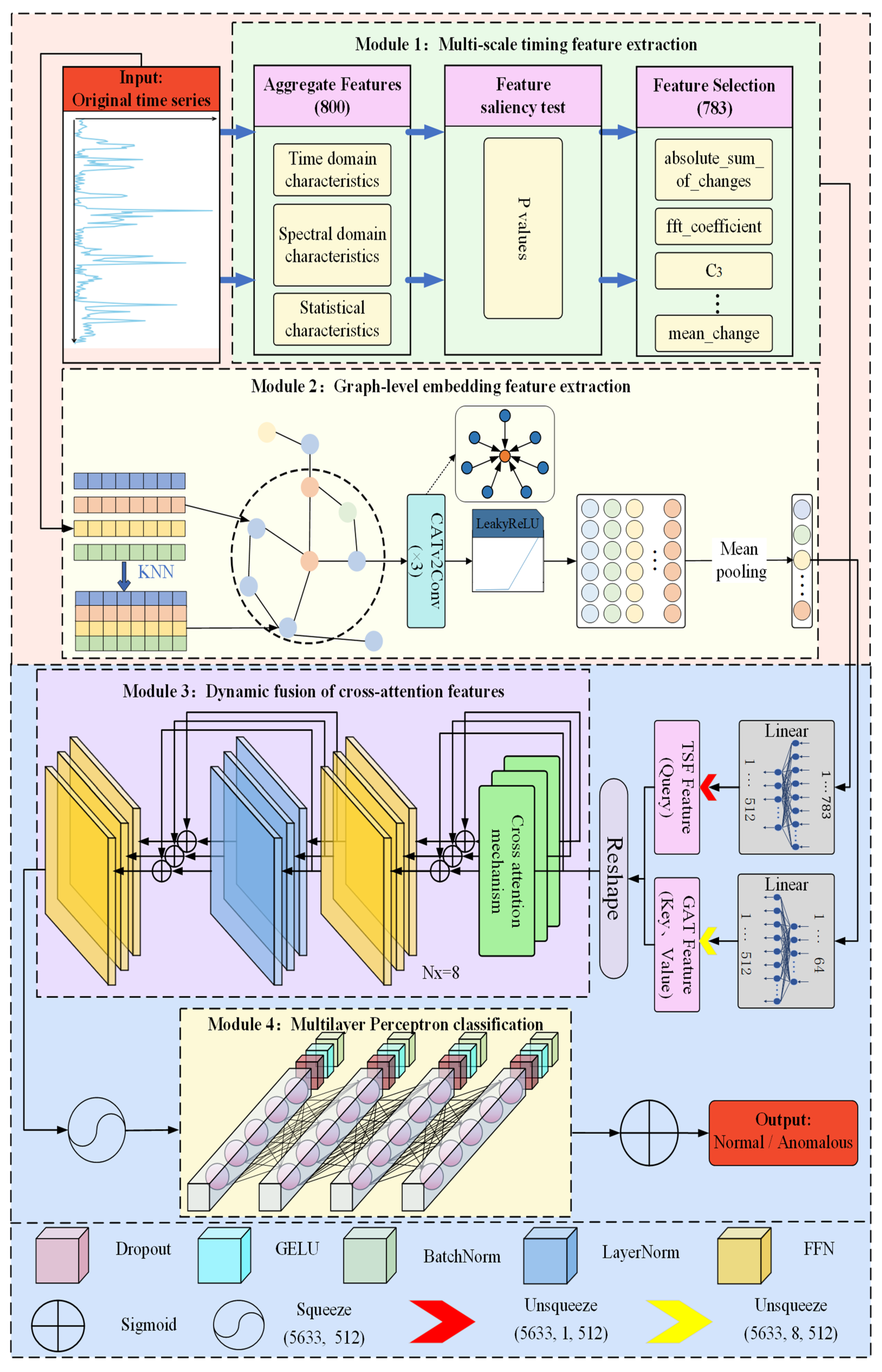- Cross-attention-based Dynamic Feature Fusion Mechanism: We design a cross-attention interaction module to enable deep coupling and dynamic weighting between multi-scale temporal features and graph-level features. This allows the model to adaptively focus on critical feature channels while suppressing redundancy from irrelevant information, significantly enhancing the accuracy and stability of anomaly detection.