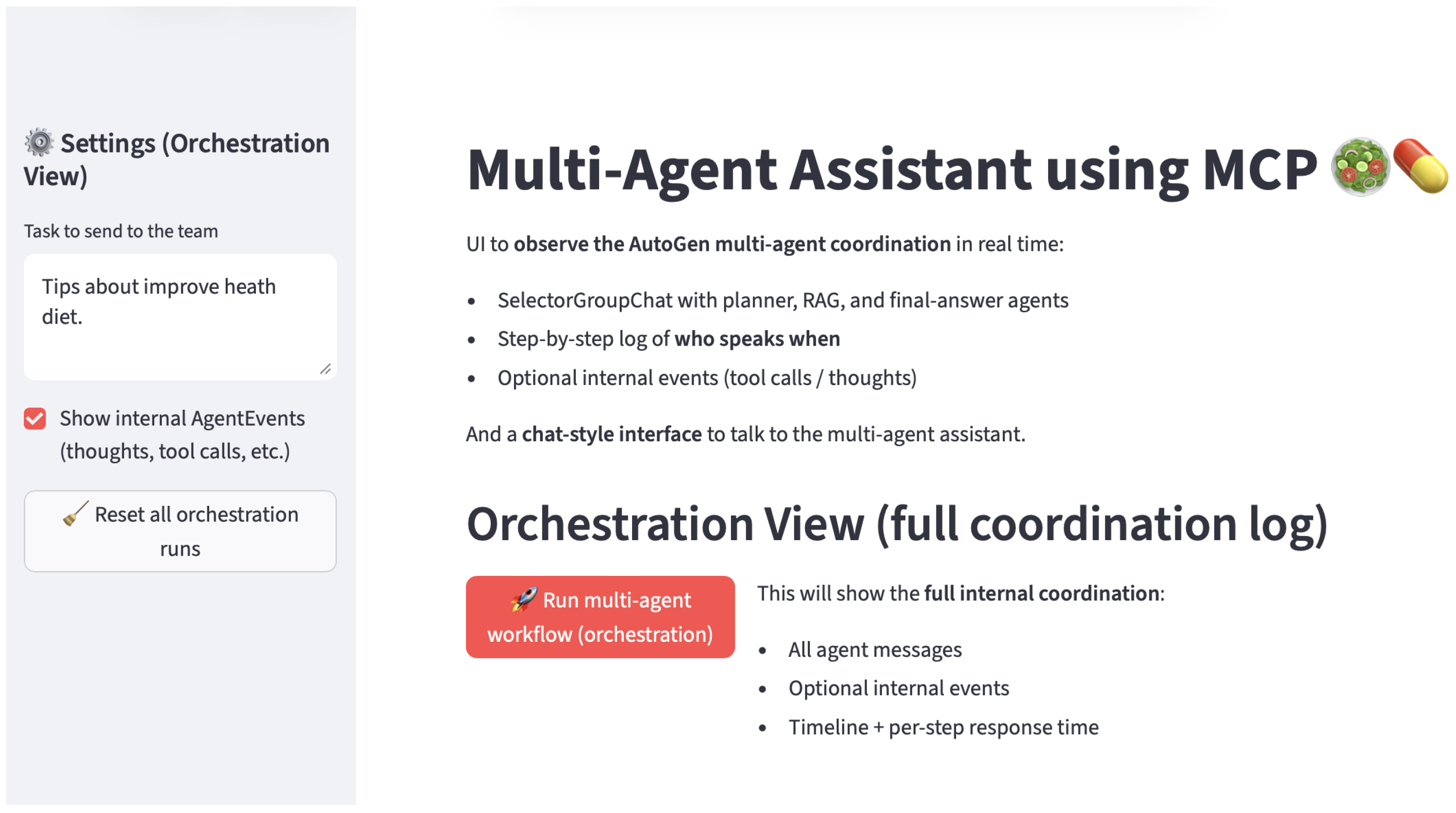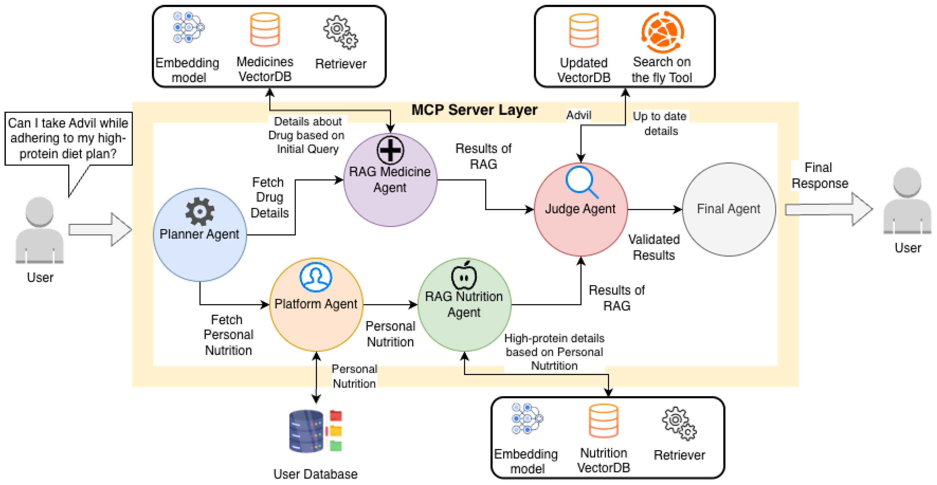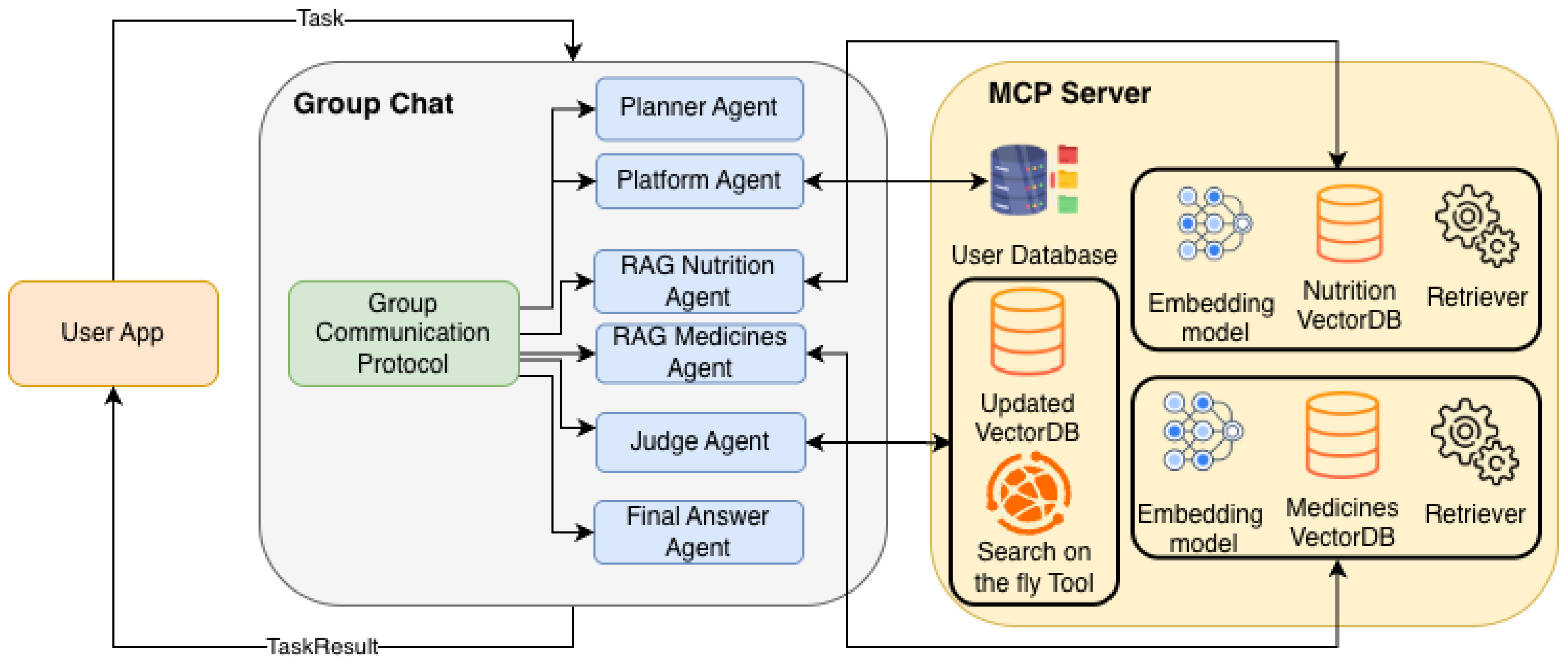 - Personal Nutrition Information with Additional Knowledge: The MAS accesses the user’s nutrition records from the PHR and enriches them using the RAG module to generate validated and accurate outcomes.