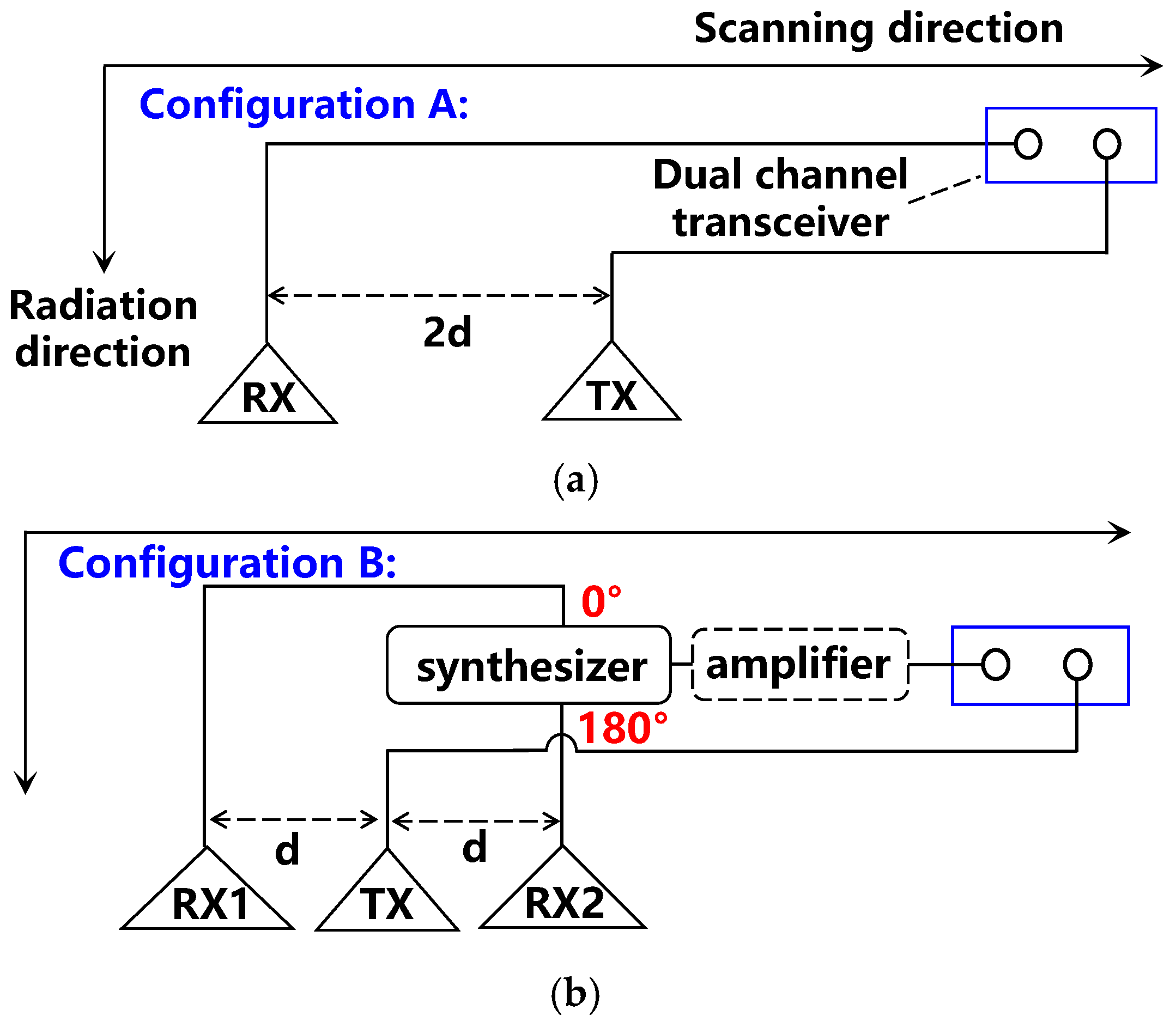 d. Compared to Config. A, Config. B adopts a 1-transmit-2-receive antenna configuration. The central antenna is the transmitter, and the two side antennas are receivers. The feed directions of the two receiving antennas are kept consistent, meaning that both antennas initially receive signals with the same phase. These two receiving antennas are then connected to an inverse power synthesizer, performing a differential operation on the two signals. This capability theoretically allows for the complete elimination of antenna direct coupling. Please note that Config. B includes an additional amplifier at the receiver end compared to Config. A. This does not constitute unfairness. Rather, Config. B achieves better isolation, allowing for greater receiver gain to enhance the dynamic range of the system. This will be verified in