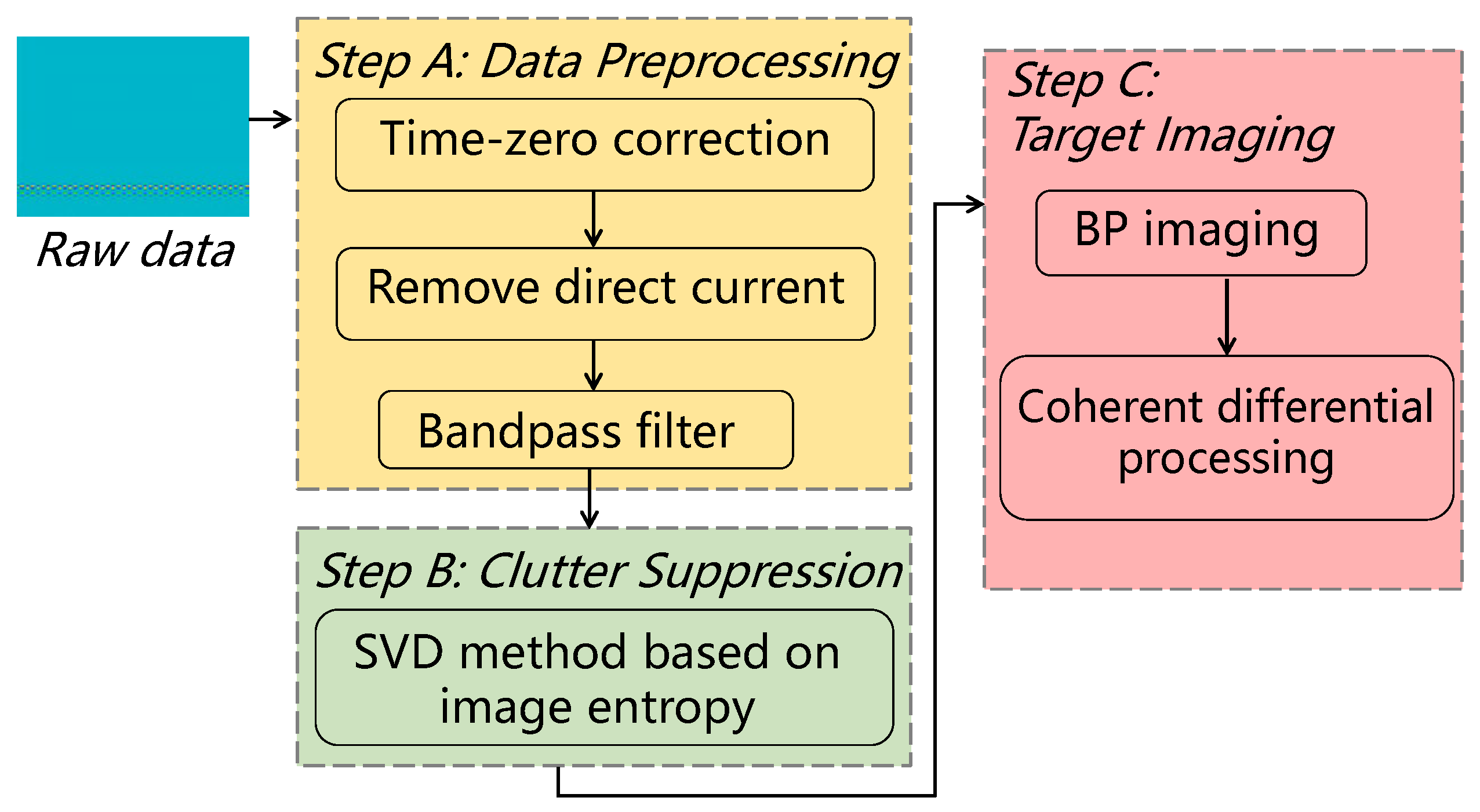 Subsequently, we employed the aforementioned radar system to test buried targets within volcanic ash. The acquired echo data is processed according to the workflow depicted in