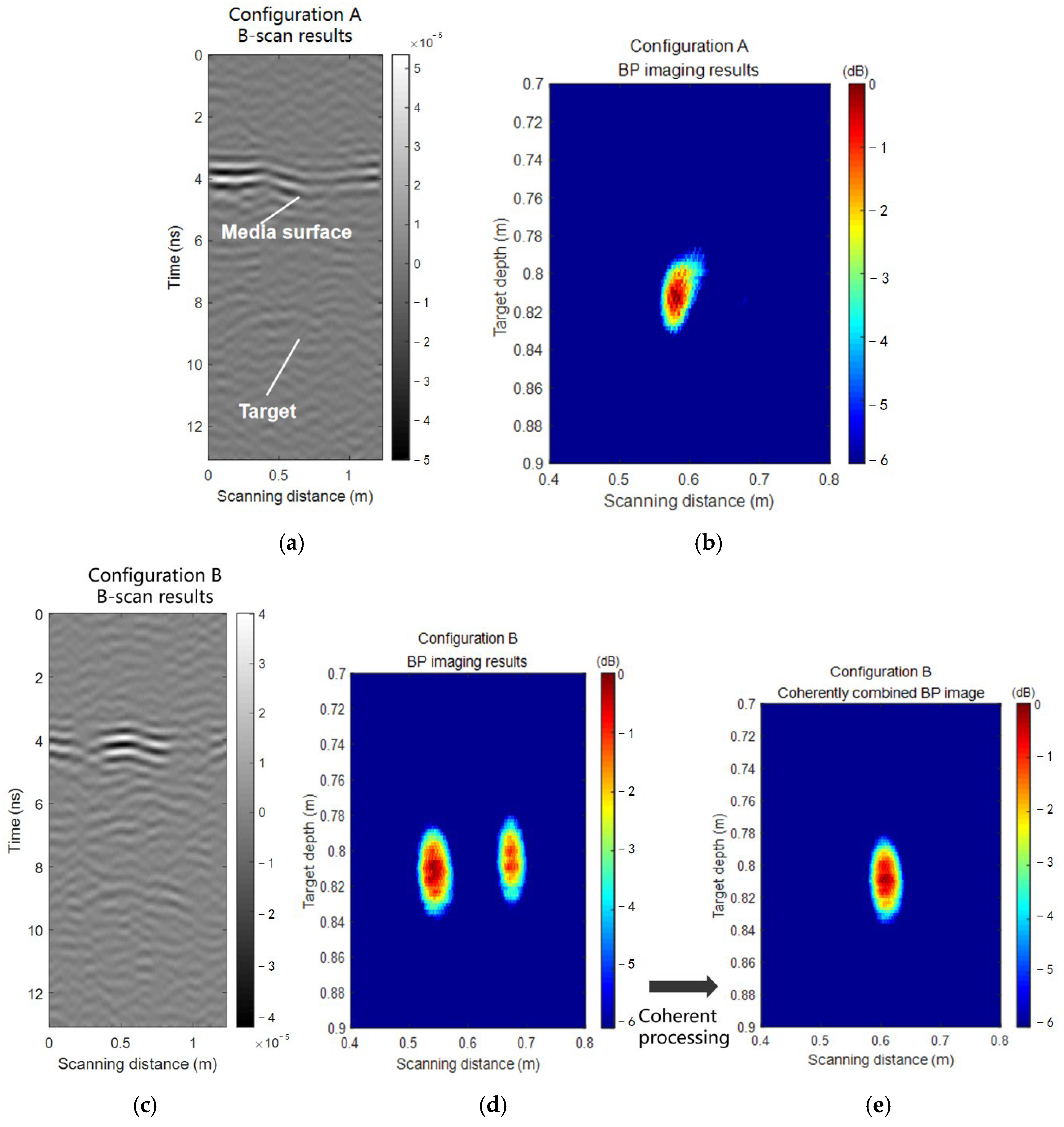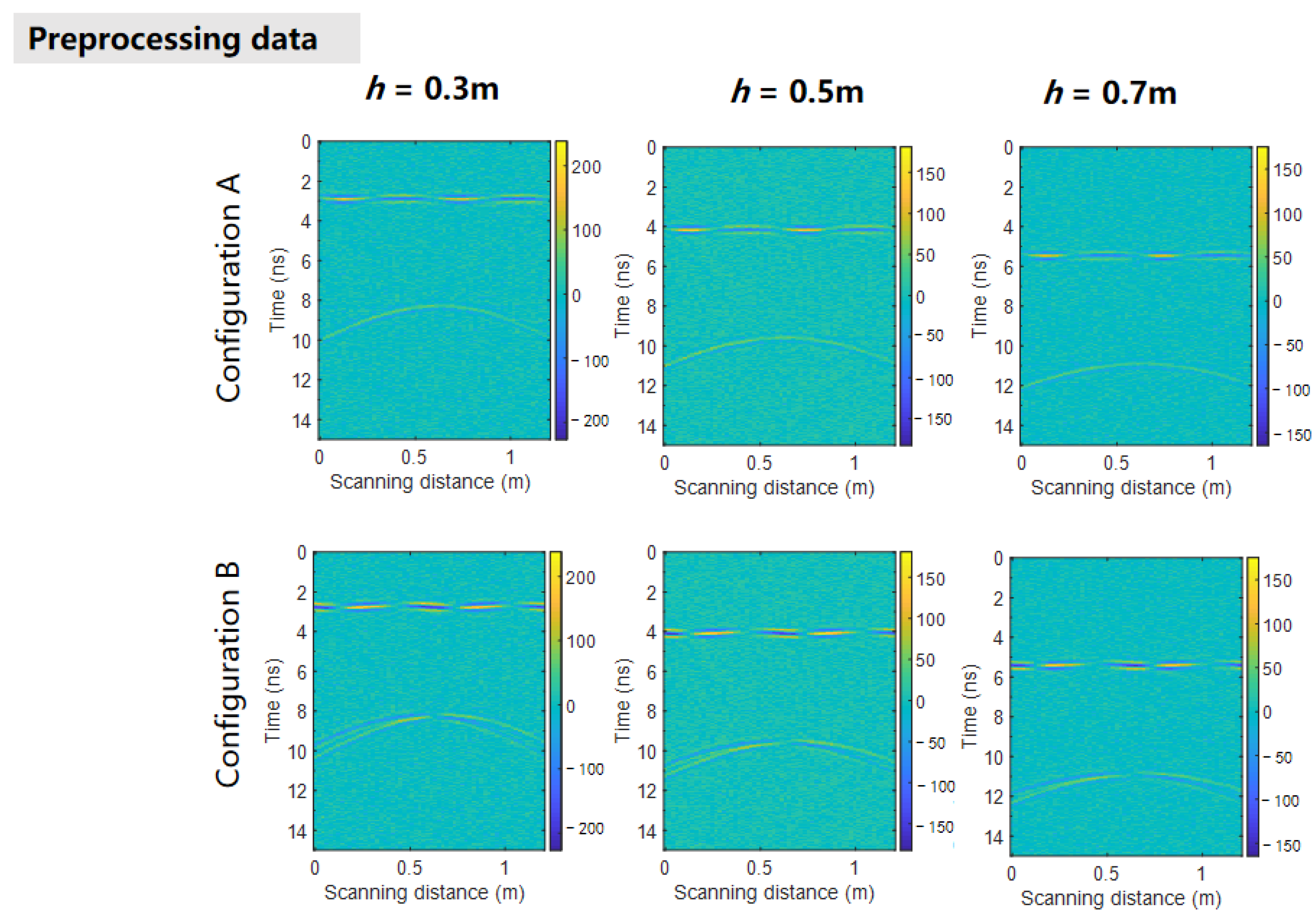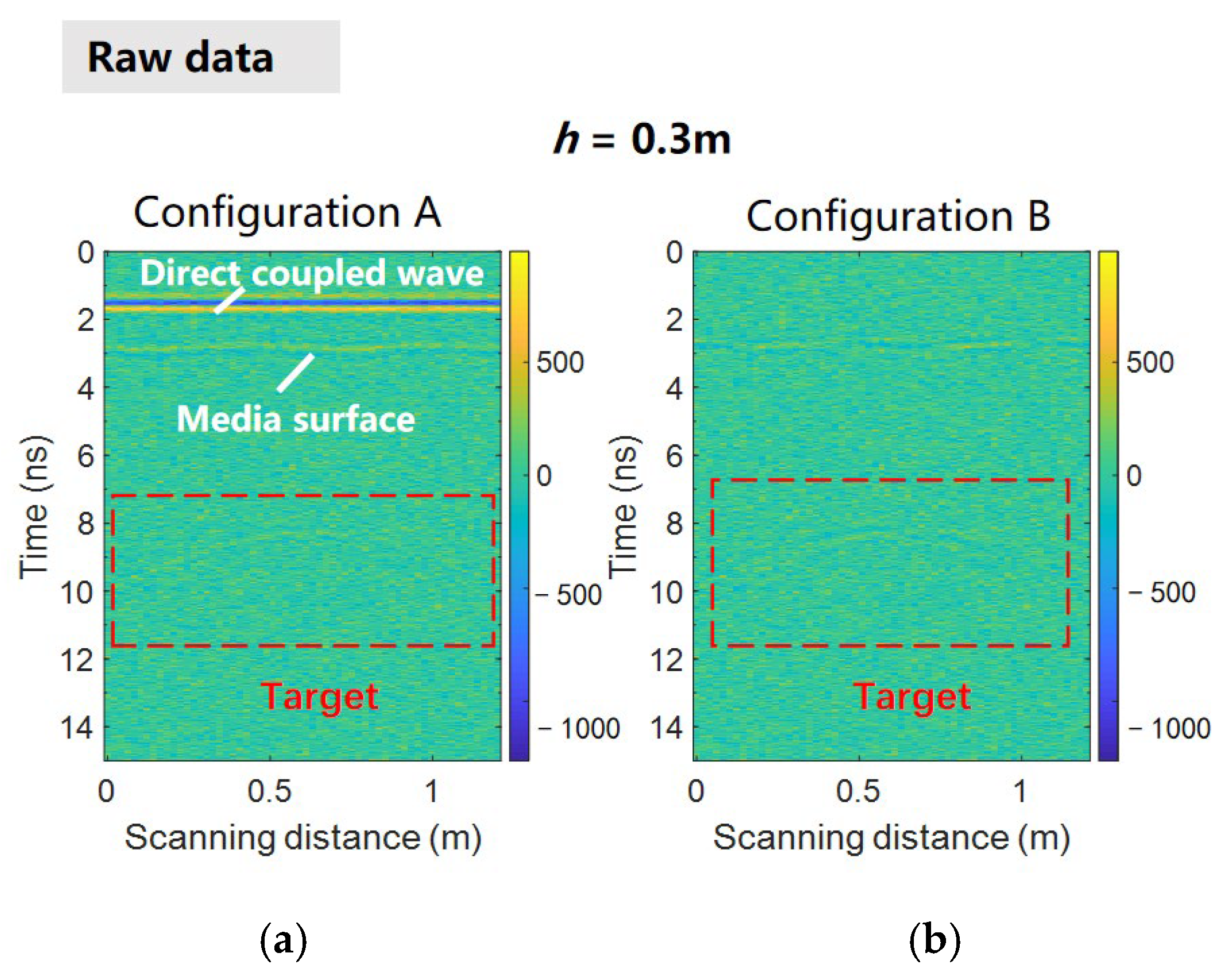 Figure 6b, respectively. It is evident that Config. A clearly displays both the direct coupling wave from the target and the reflected wave from the medium surface. Under the same contrast view, due to the undulations on the simulated medium surface, Config. B left behind the reflected waves on the medium surface and the target hyperbola. This phenomenon was already demonstrated in the preceding theoretical analysis. Due to the strong direct coupling wave of the original data antenna, it is difficult to observe the target characteristics. And similar results have also been observed at other heights, so we will not list them one by one here.