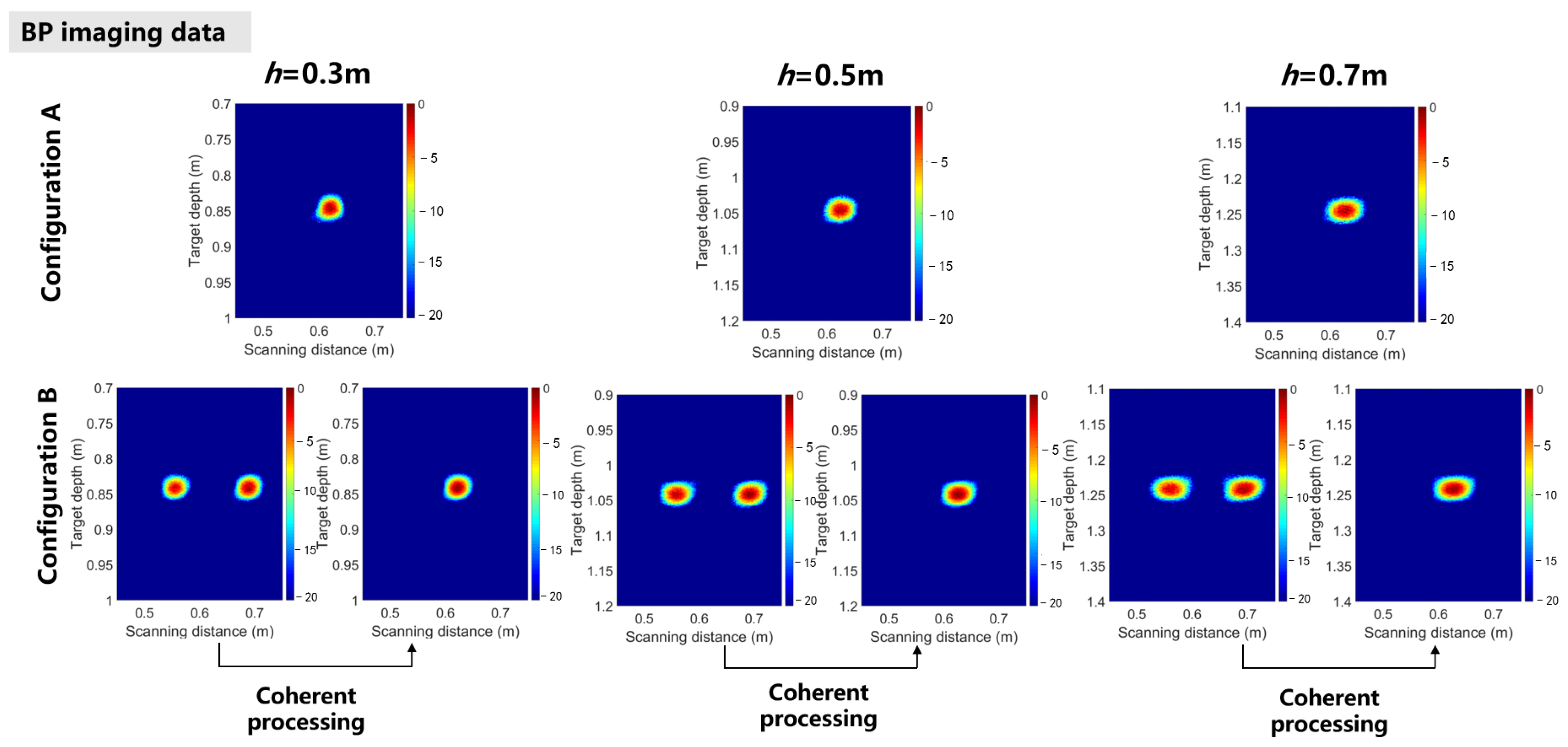 h = 0.3 m, the target can be detected. At this point, the PA and SCR of Config. B are both higher than Config. A, and SCR can be improved by 1.9 dB. However, the FWHM of Config. B is slightly worse than Config. A. When