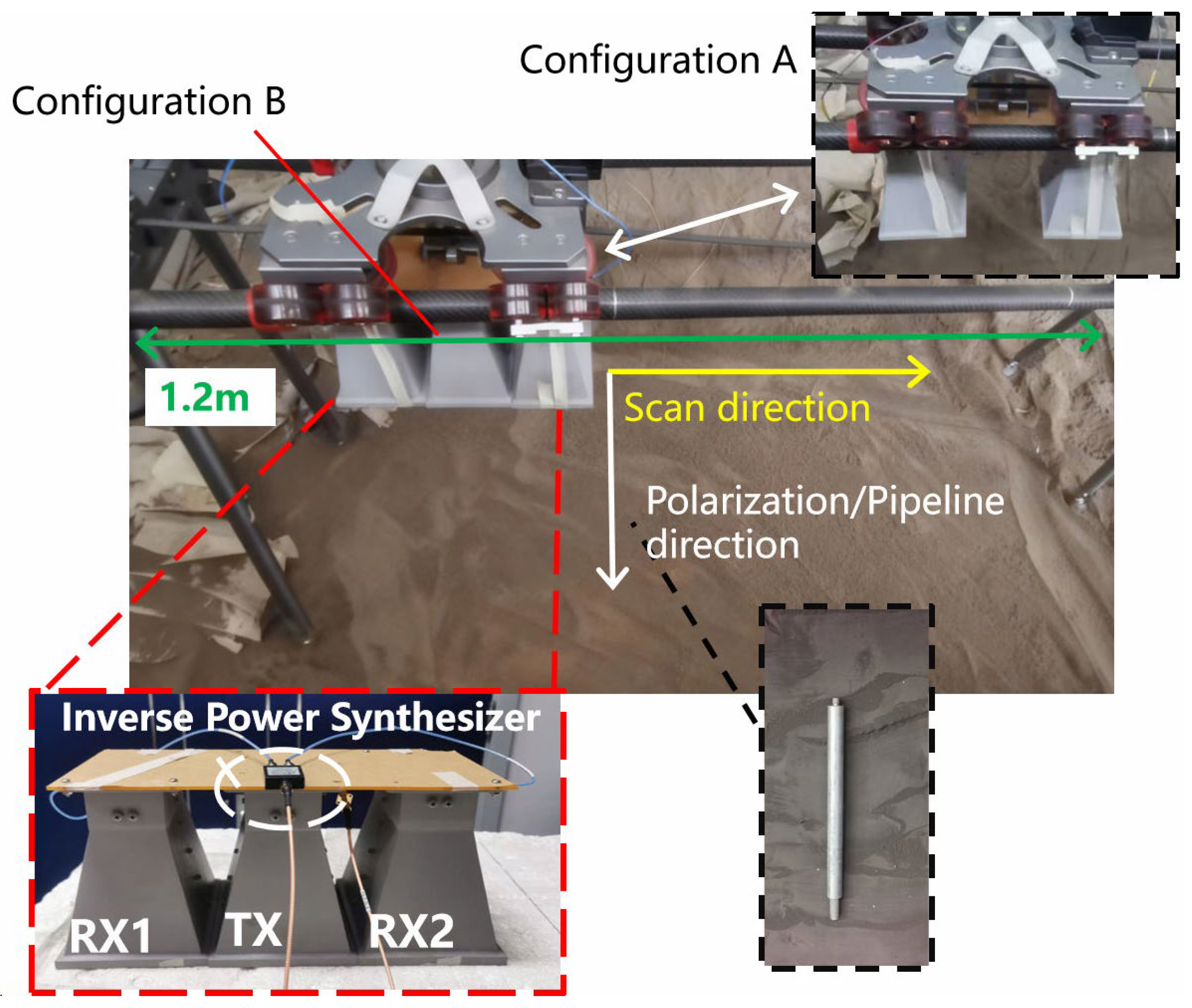 Figure 9. The radar and antennas were mounted on a rail platform to emulate the operational environment of an in-vehicle GPR. The rail height was adjustable to test scenarios with varying antenna heights. The detection medium was volcanic ash with a dielectric constant of approximately 3. It should be noted that, due to construction activities, the tested medium contained numerous interferences. The target was a 4 cm diameter metal pipe buried 0.5 m beneath the volcanic ash layer. The antenna polarization was aligned along the direction of the metal tube and perpendicular to the direction of the survey line. This configuration aligns with practical applications [