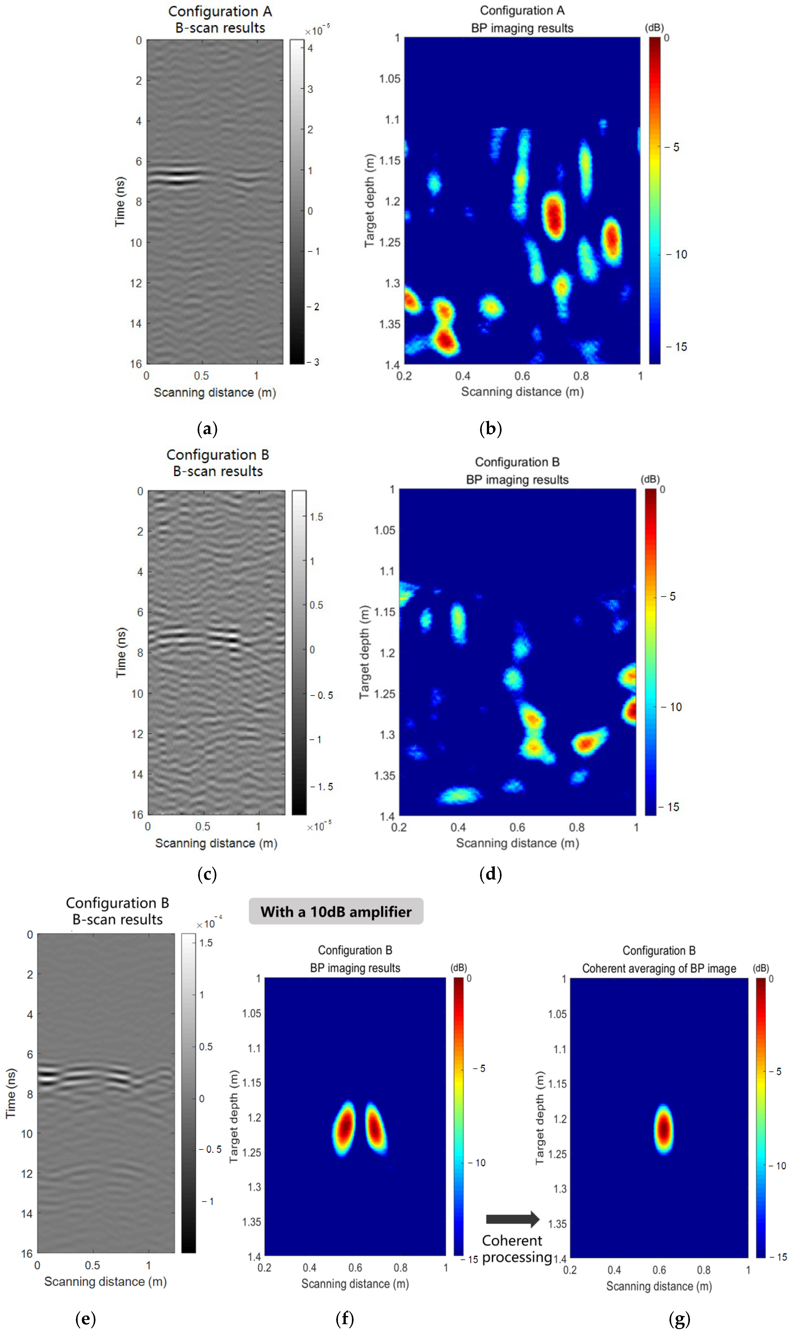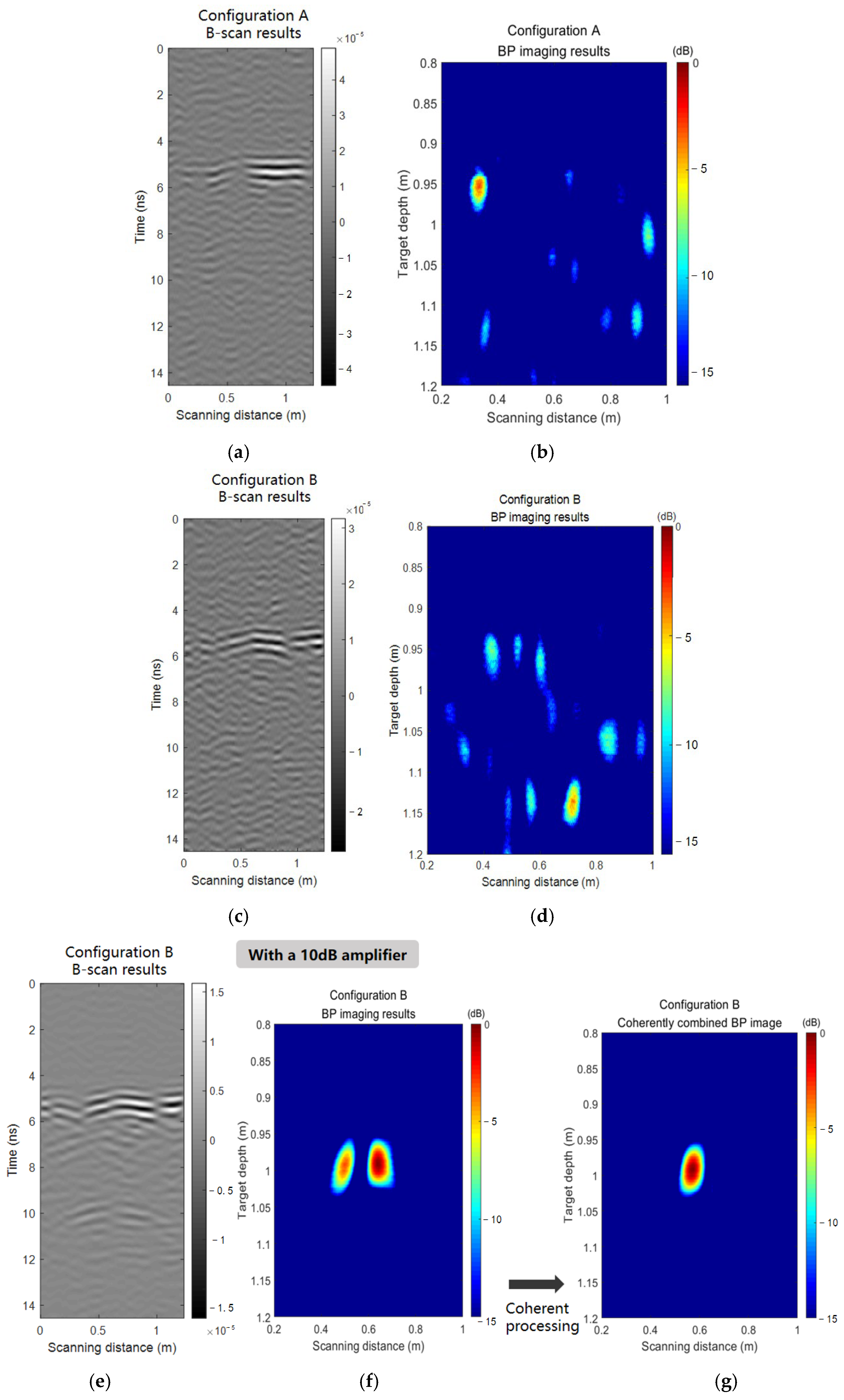 Figure 11e employs coherent differential processing. However, Config. B demonstrates slightly better target focusing performance compared to Config. A. This result is consistent with the pattern obtained from the simulations in