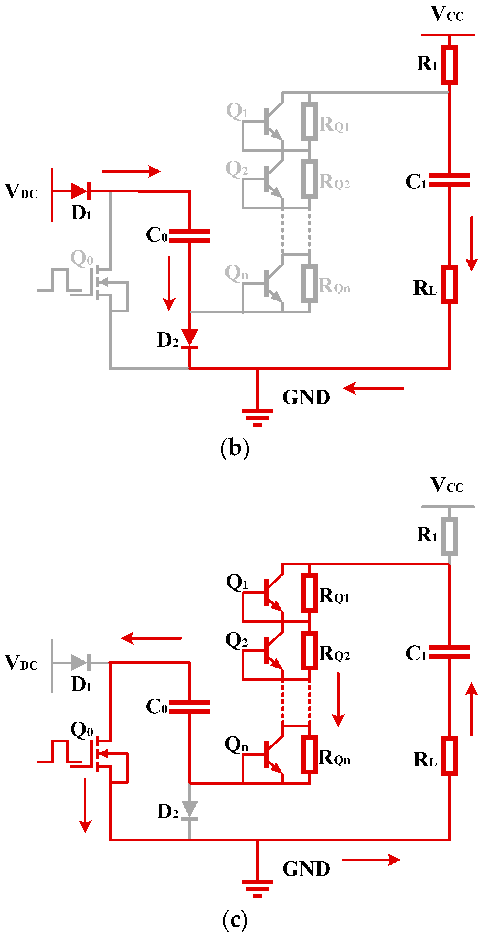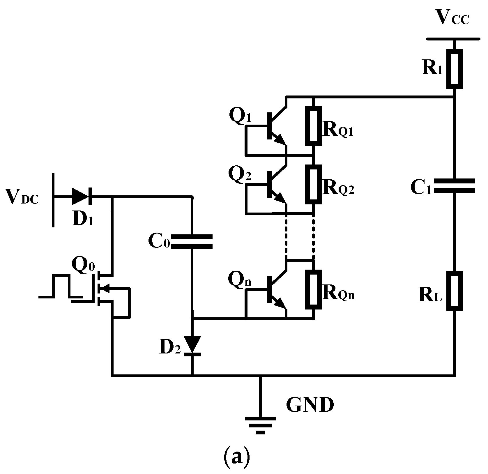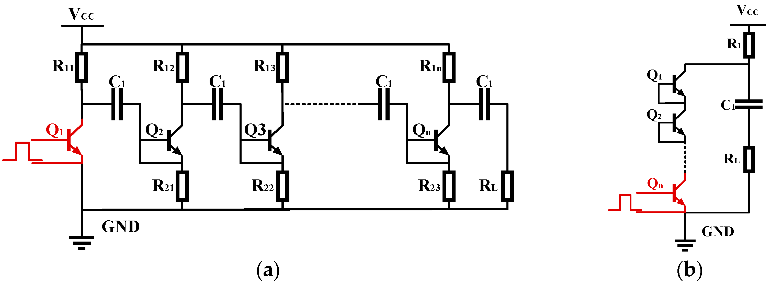 15] proposed an improved avalanche Marx circuit. By integrating a protection resistor in series with the second-stage transistor, they effectively suppressed the passive boost voltage, resulting in a 20-stage avalanche Marx that produced a high-voltage pulse with a rising edge of 230 ps and an amplitude of 1.65 kV.