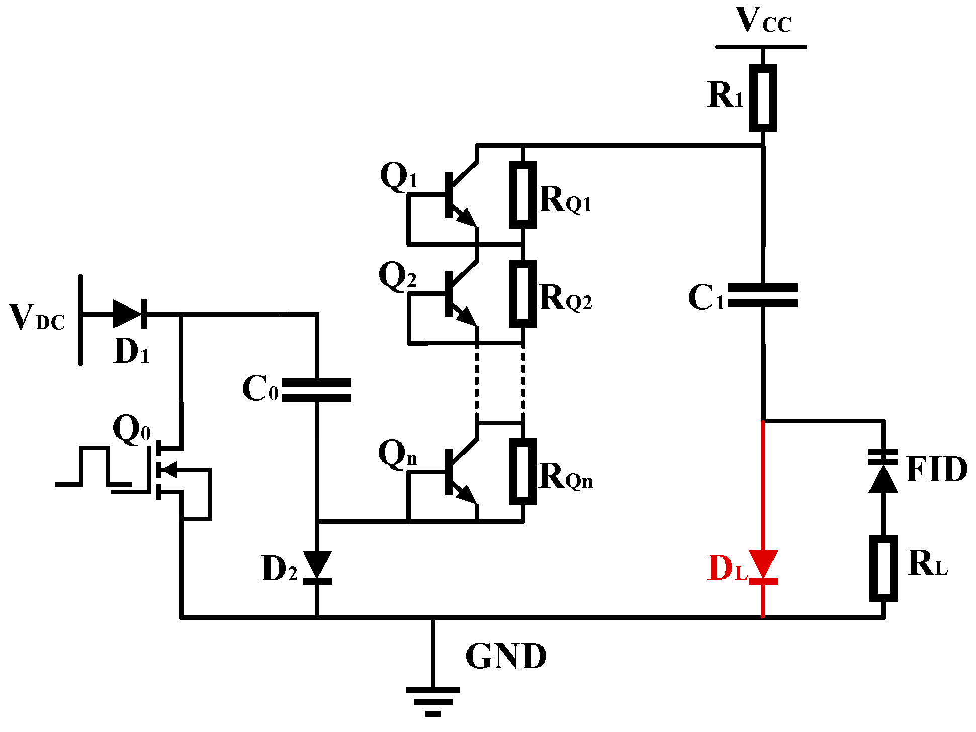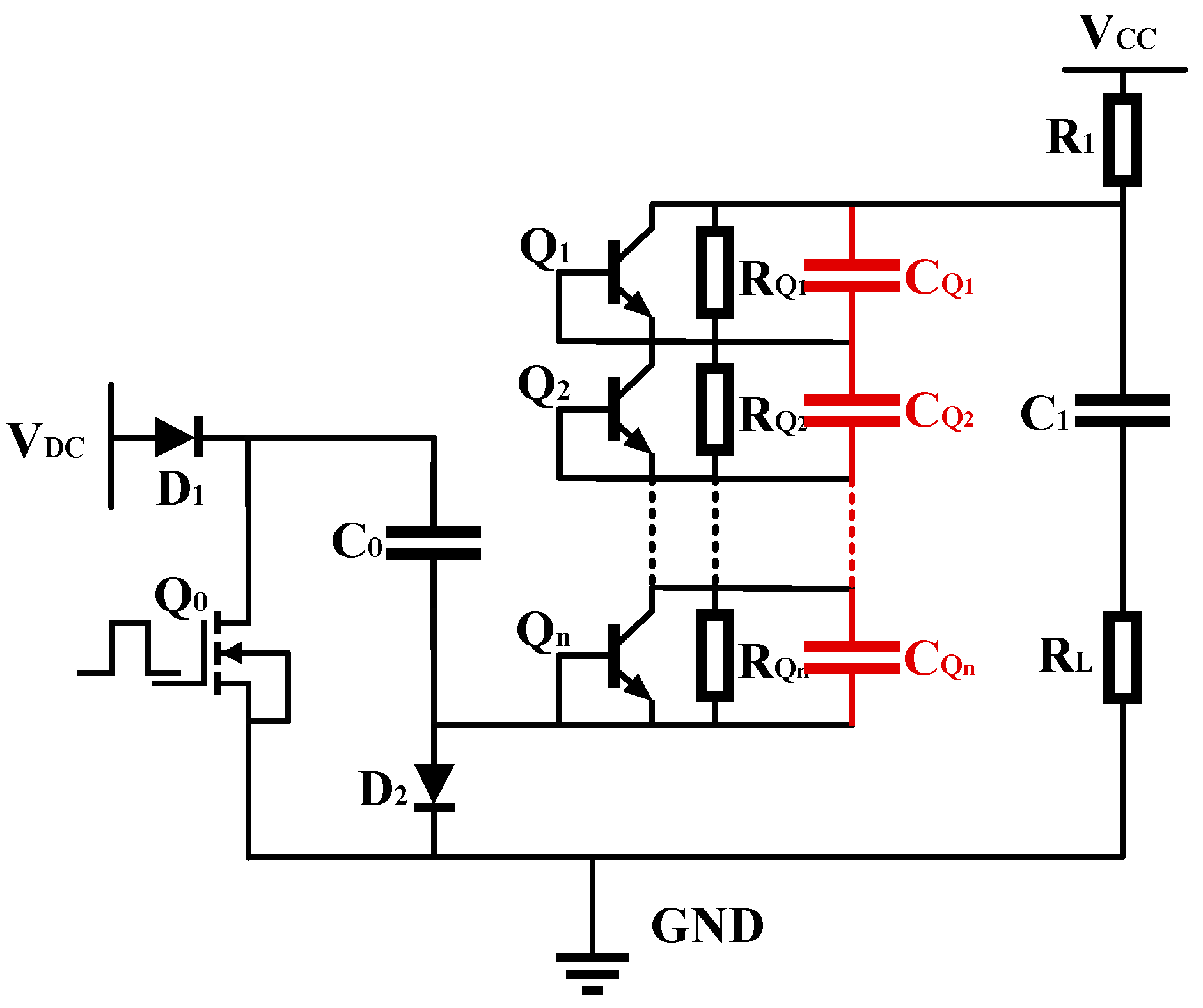 In this configuration, VCC represents the bias voltage DC power supply for the series structure of the avalanche transistors, VDC serves as the trigger pulse DC power supply, R1 functions as the charging resistor, and RQ1–RQn are the voltage equalizing resistors. Additionally, C0 and C1 are the respective energy storage capacitors, Q0 denotes the MOSFET, Q1–Qn are the series avalanche transistors, and RL is the load resistor.