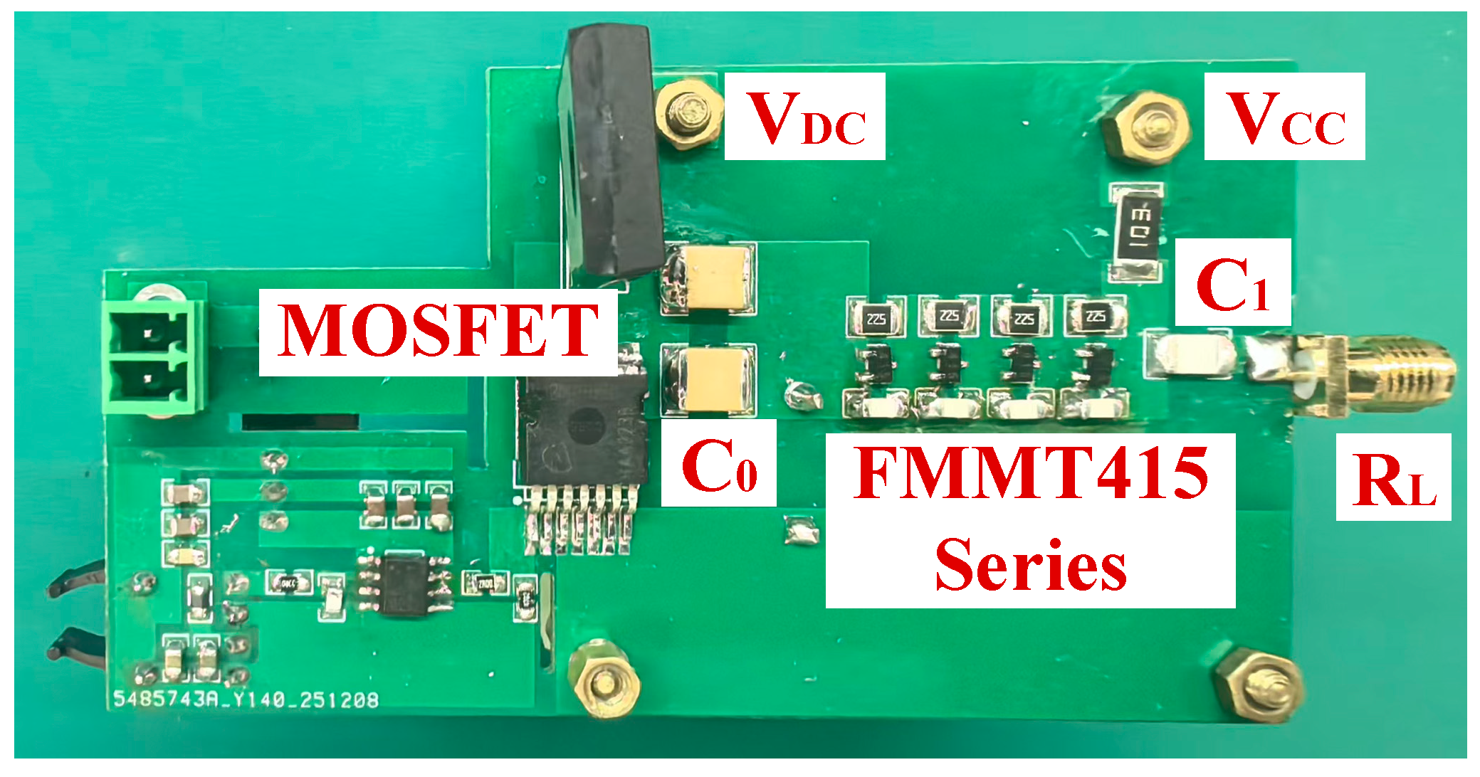 To achieve a rapid leading pulse, the avalanche transistor FMMT415 (DIODES, SOT23 package) was chosen for the series test experiment involving four avalanche transistors. The printed circuit board (PCB) utilized for this experiment is depicted in