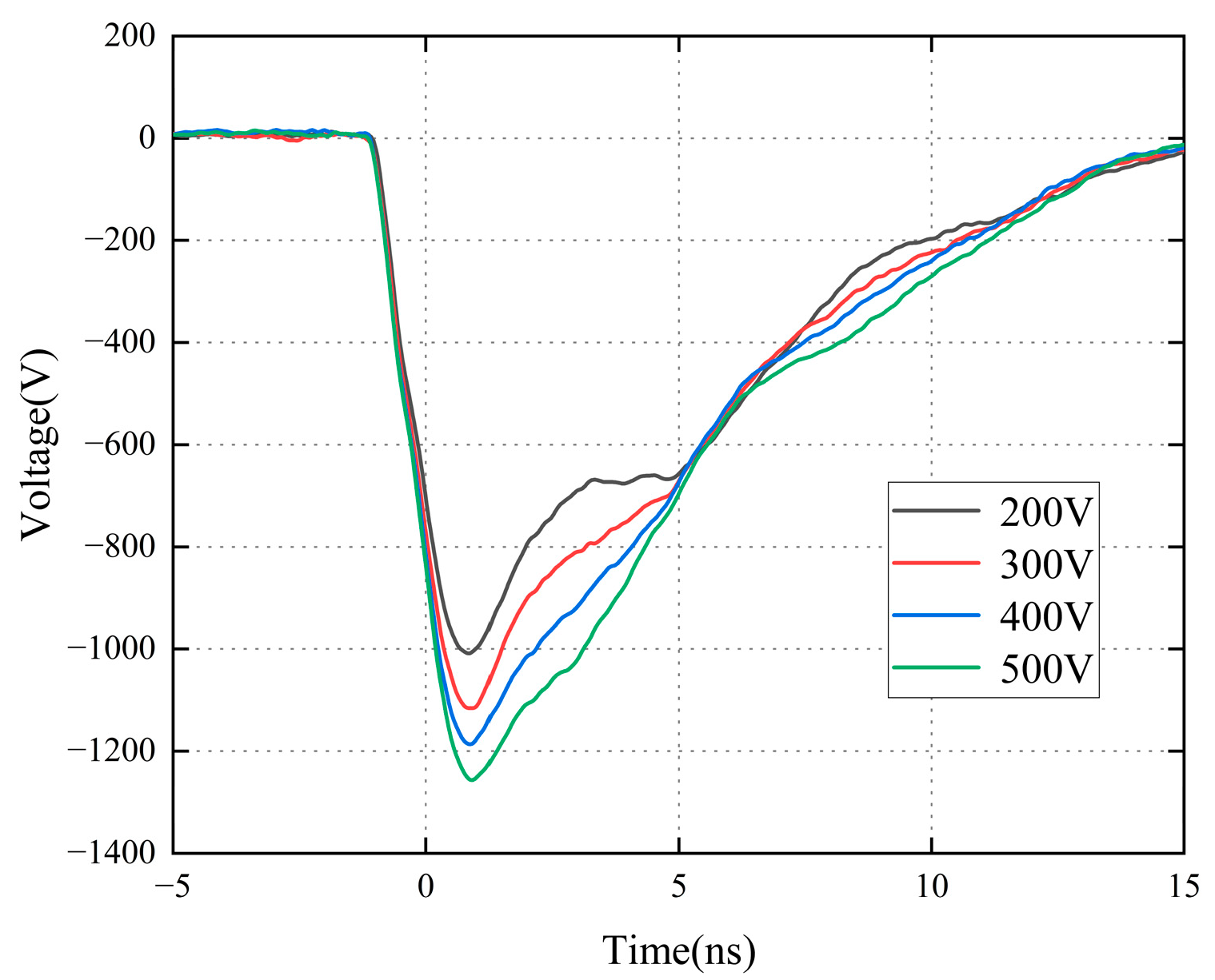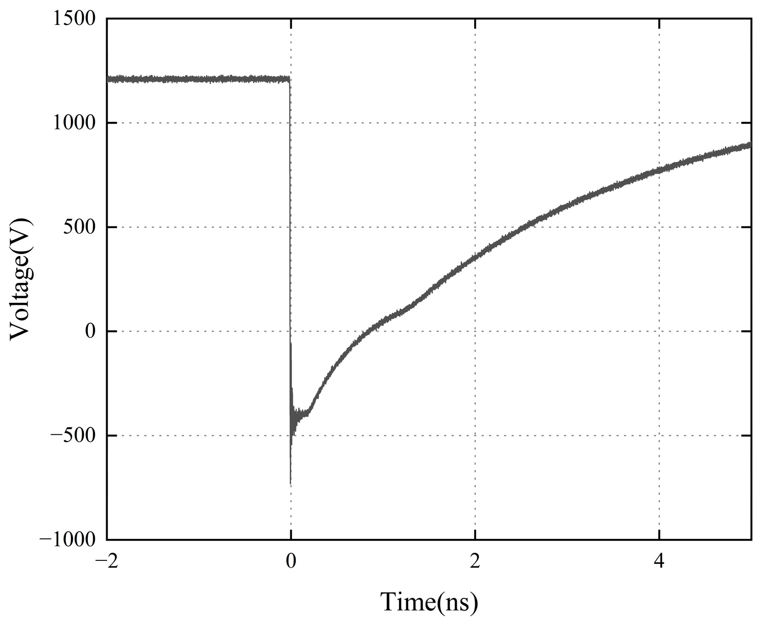 With a maintained bias voltage of 1200 V and an input voltage of 500 V, a 15 pF capacitor is connected in parallel. Under these conditions, the falling edge decreases from 1.27 ns to 1.00 ns, the amplitude increases from 1270 V to 1320 V, and the slope rises from 1.00 kV/ns to 1.32 kV/ns, representing a 32% increase.