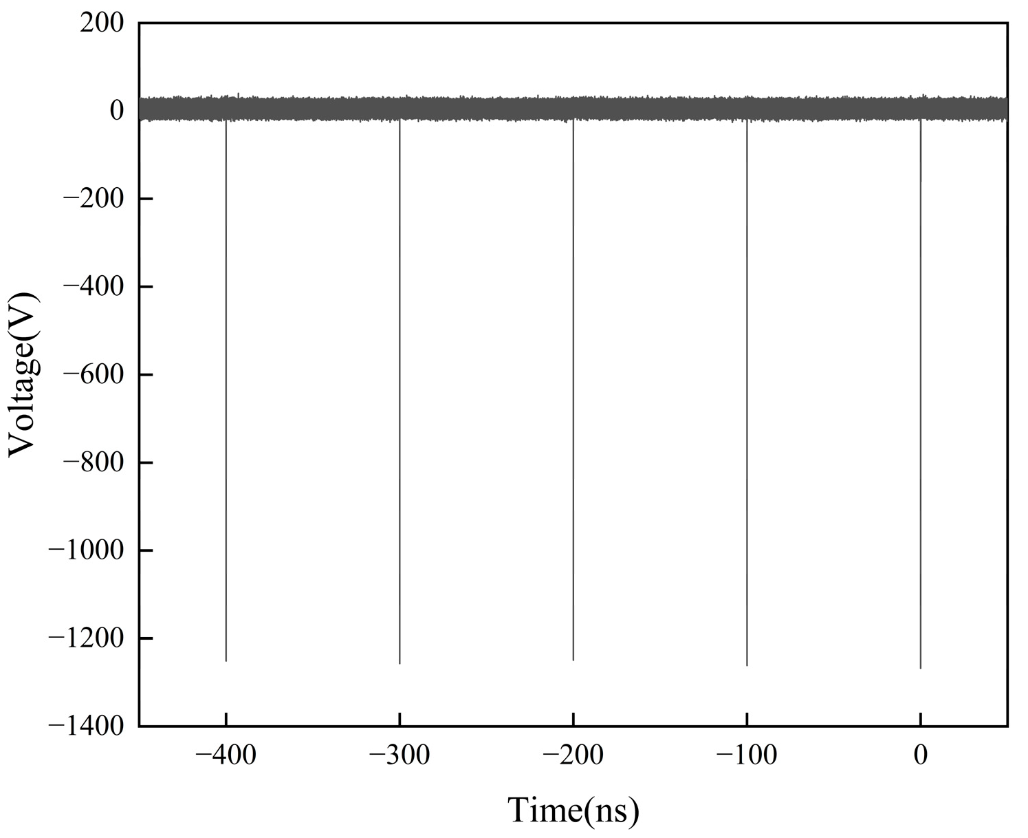 The output waveform indicates that the output pulse amplitude of the series circuit involving four avalanche transistors can be adjusted between 1020 and 1270 V. This finding confirms that the circuit design presented in this paper can achieve an adjustable output pulse amplitude by varying the input pulse voltage, thereby surpassing the bias voltage limit. Additionally, to assess circuit performance, a repetition frequency experiment was conducted. The circuit consistently outputs 1260 V at a frequency of 10 kHz with minimal jitter. The waveform diagram of the repetition frequency experiment is shown in