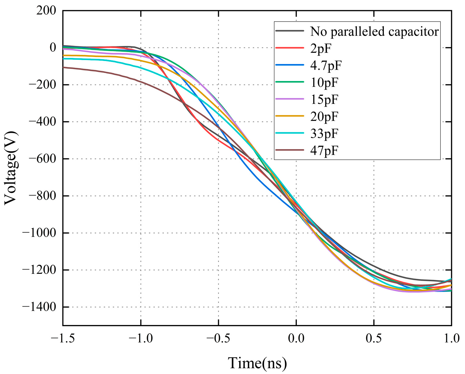 The experimental results indicate that when the capacitance of the parallel capacitor is less than 15 pF, an increase in capacitance corresponds to a decrease in the falling edge and an increase in the conduction speed of the avalanche transistor series structure. However, as the capacitance continues to rise beyond this threshold, the falling edge begins to increase, indicating that the discharge time constant becomes predominant, resulting in a reduction in conduction speed. Furthermore, with further increases in capacitance, the tail of the output waveform starts to distort. Specifically, when a 15 pF capacitor is connected in parallel with the avalanche transistor, the output pulse amplitude rises from 1270 V to 1320 V, the falling edge decreases from 1.27 ns to 1.00 ns, and the slope increases from 1.00 kV/ns to 1.32 kV/ns, representing a 32% increase.