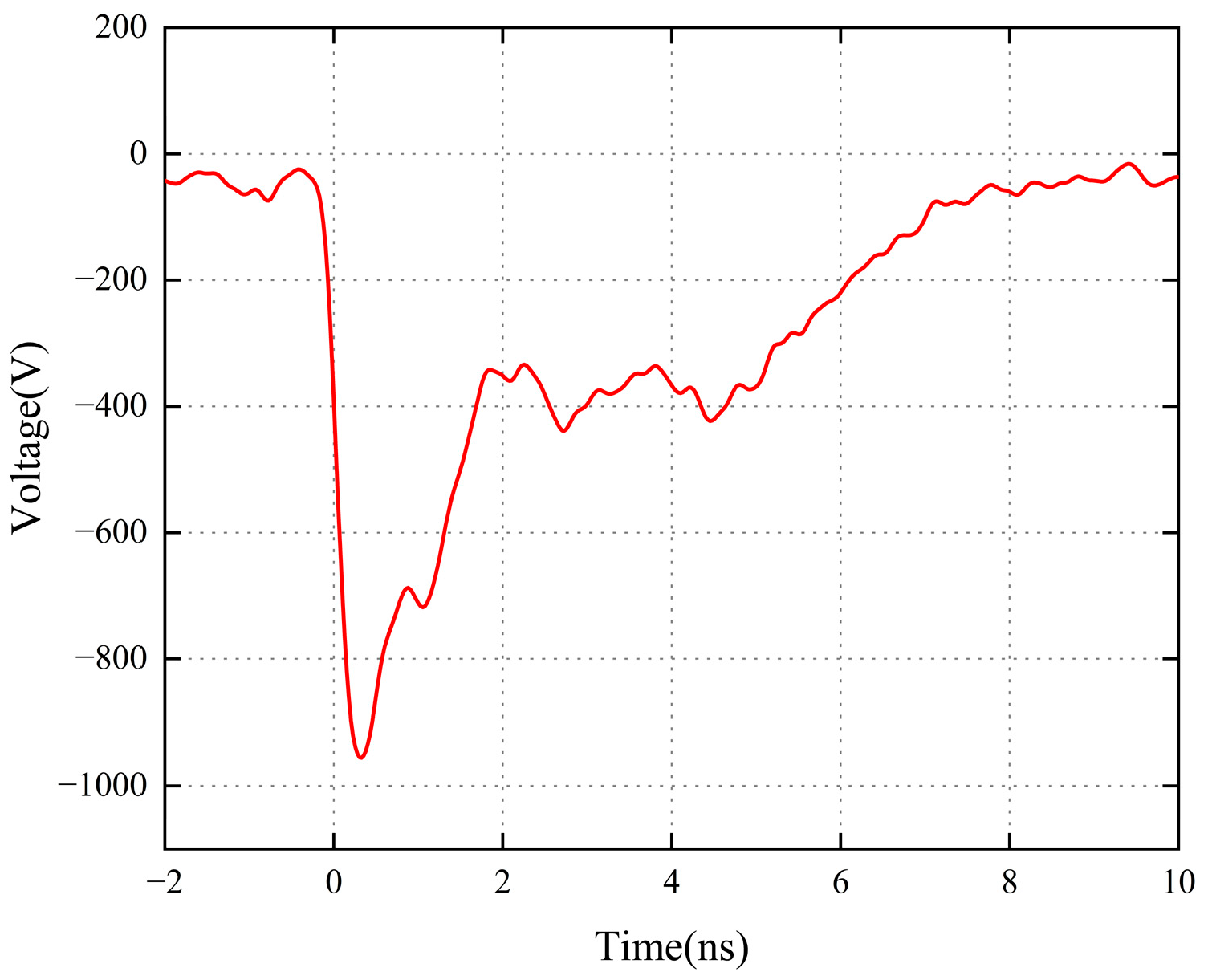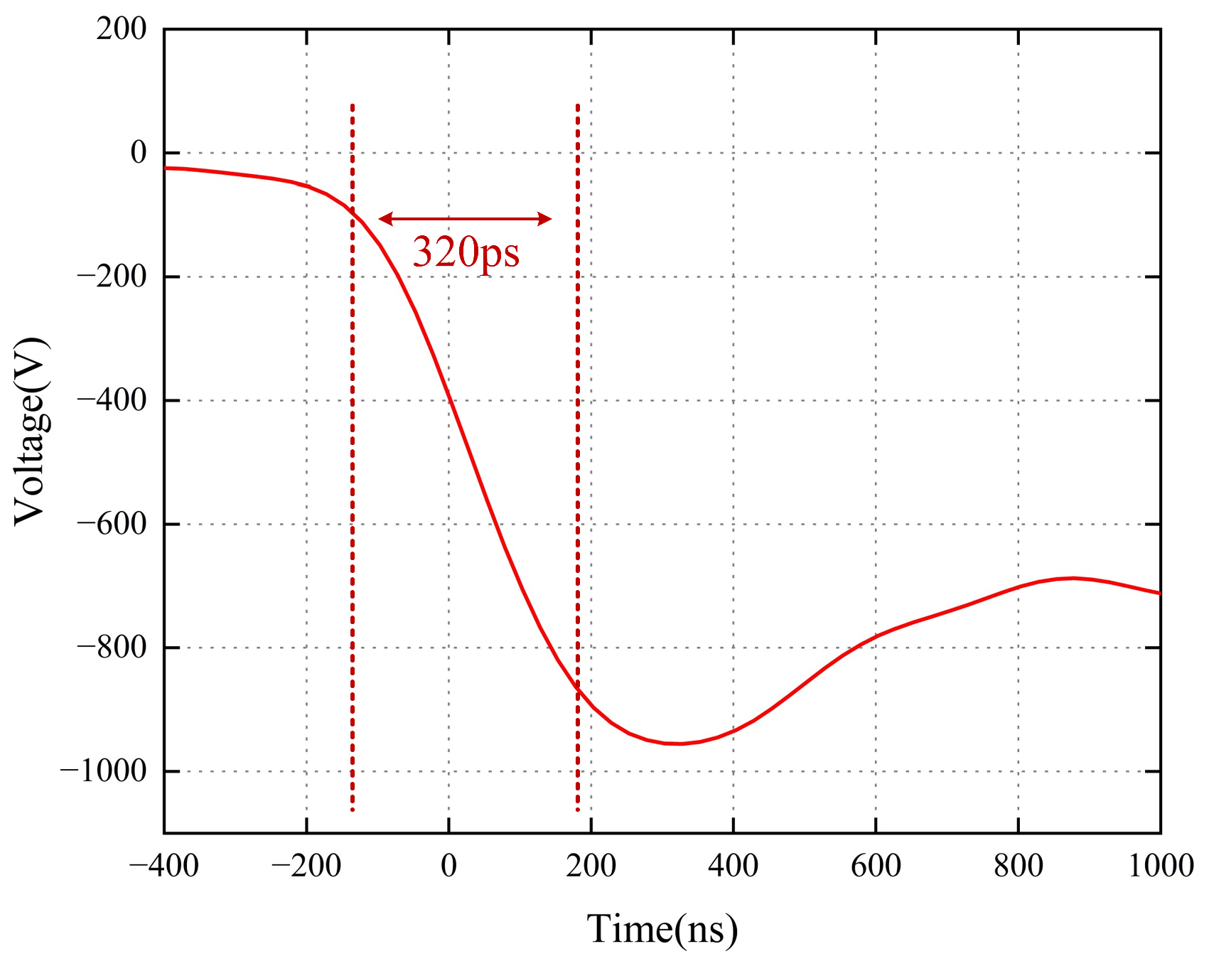Additionally, circuit expansion design is conducted, utilizing the aforementioned fast leading-edge pulse as the test trigger pulse for the 500 V withstand voltage FID. The falling edge of the output pulse measures approximately 320 ps, with an amplitude of 965 V.
