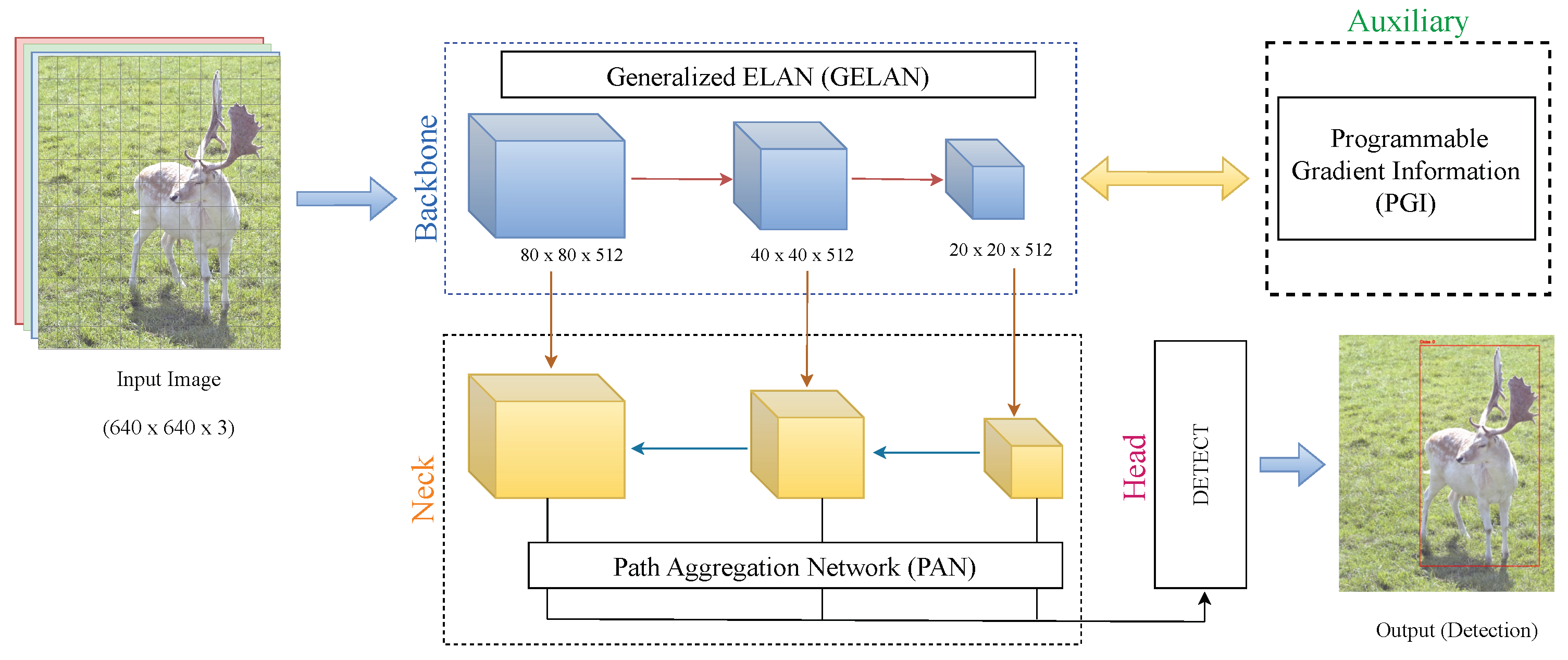 YOLOv9 architecture marks a significant improvement over earlier YOLO versions in terms of speed and accuracy of object detection. A key challenge it addressed is the information bottleneck problem in deep neural networks, where gradients diminish or useful information is lost as they propagate through successive layers of large models. To overcome this, YOLOv9 introduced Programmable Gradient Information (PGI), which ensures more reliable gradient flow and enhances the network’s ability to learn from complex image features. As shown in