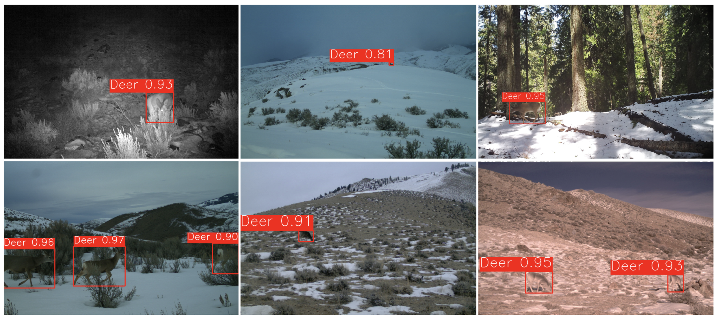 31]. The Cameratraps project contains over 1.5 million camera trap images collected from video sequences across multiple regions. While the original dataset provides only sequence-level labels without bounding-box annotations, we filtered approximately 7000 images containing deer (confidence score > 0.9) and manually annotated 3095 images with bounding boxes using the Computer Vision Annotation Tool (CVAT) [
