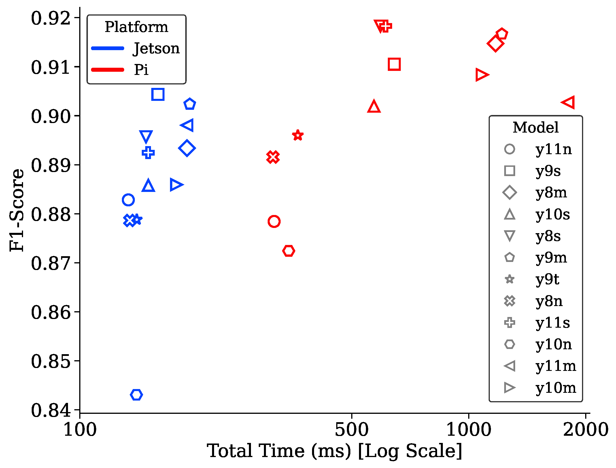Frames Per Second (FPS): FPS is derived strictly from inference time to benchmark the maximum computational throughput of the edge devices. This helps to isolate the accelerator’s performance from system-level bottlenecks related to processing time (system overhead).