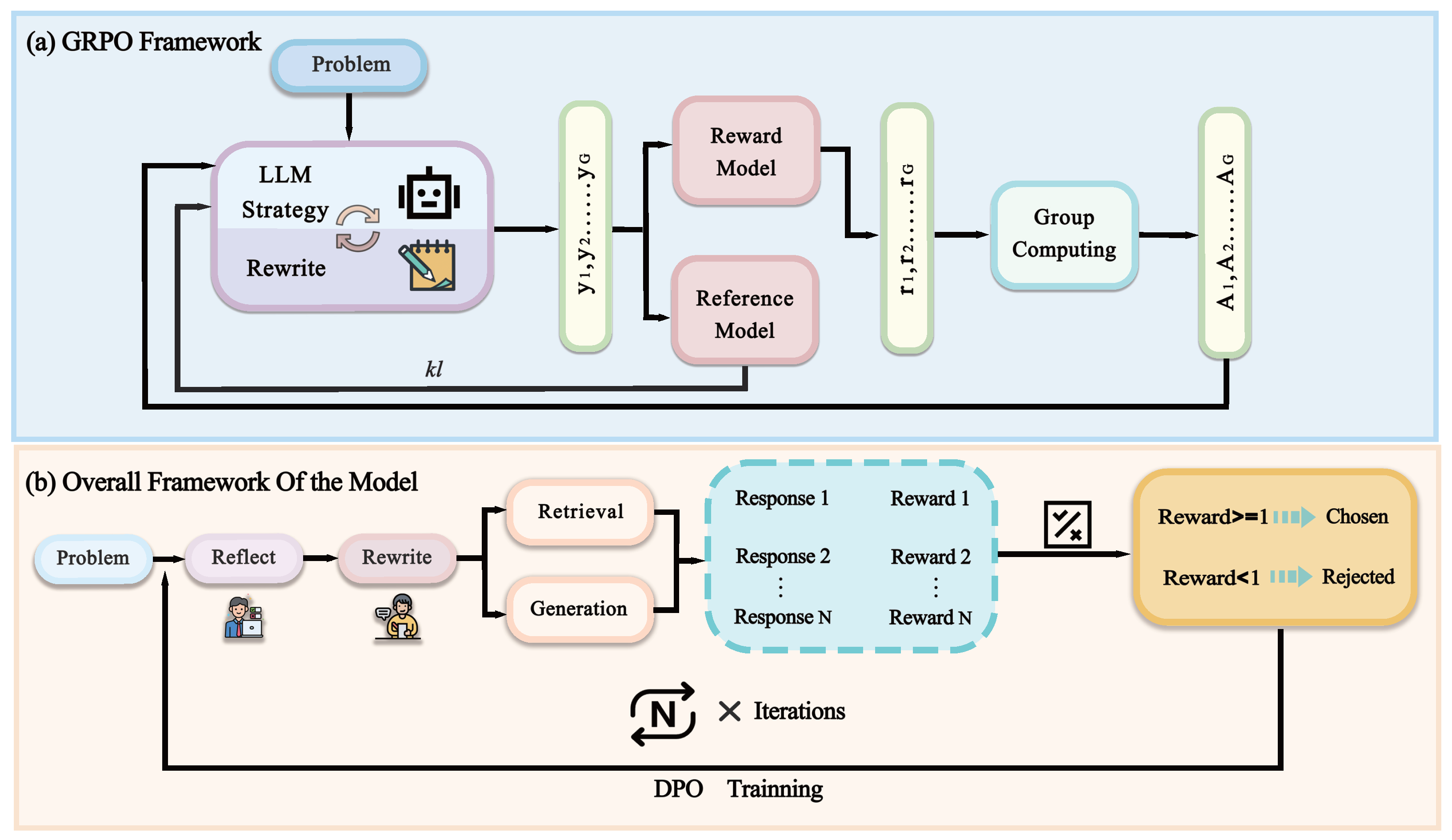 1]) is employed to optimize the reasoning process as a whole. GRPO guides the model to improve its query rewriting and reasoning steps through task-level rewards. At the answer selection stage, Direct Preference Optimization (DPO) (Rafailov et al. [
