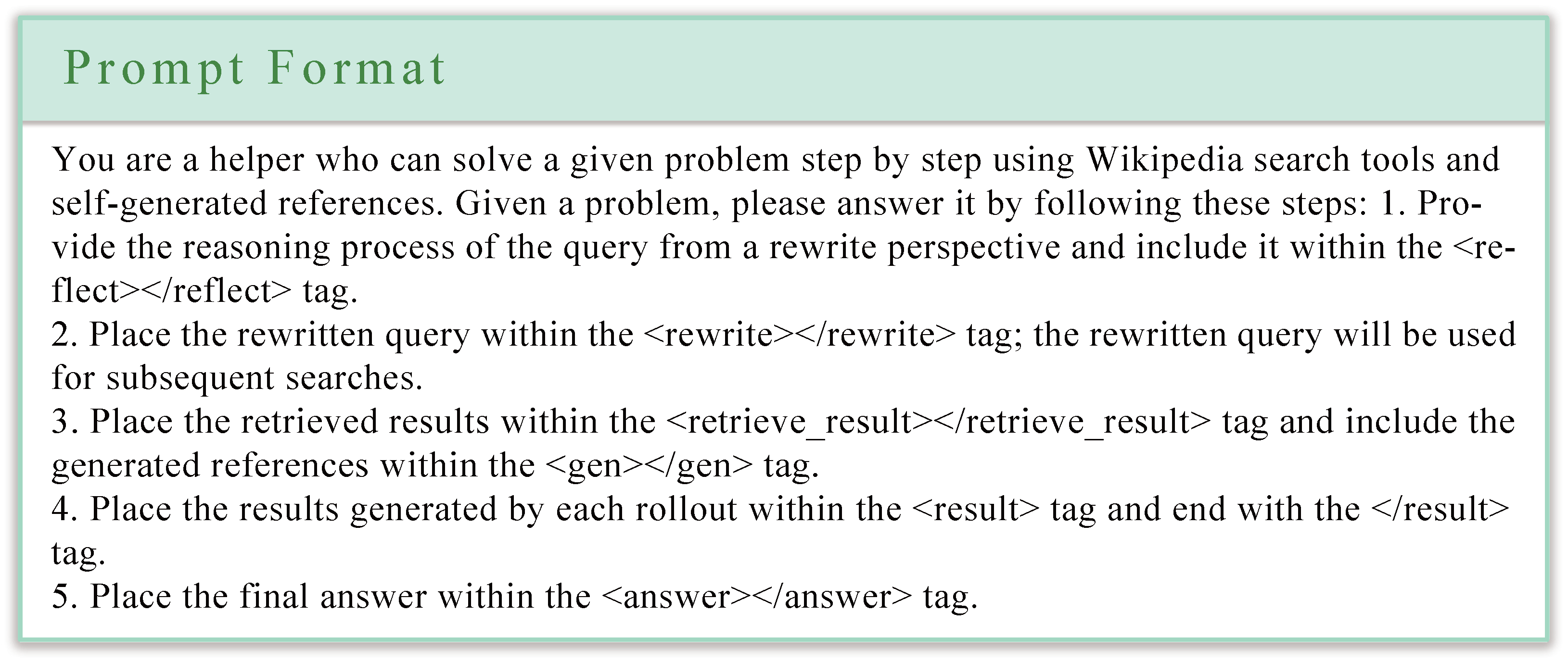 To guide the Qwen2.5-3B model in producing structured rollouts with query rewriting, we design a concise prompt template. The template ensures the model adheres to the required format, including reasoning, query rewriting, and final answer presentation. As shown in