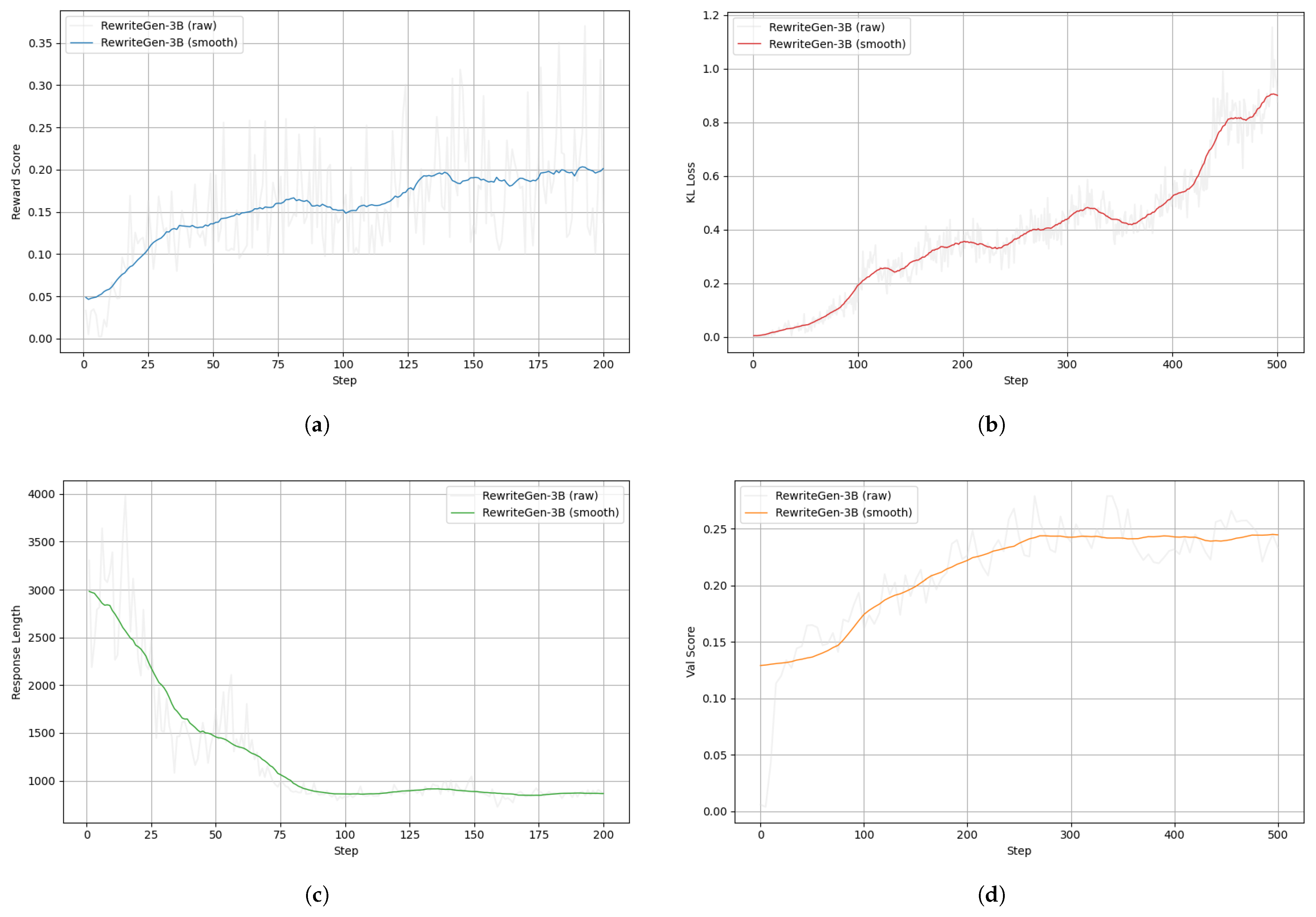 Figure 3c, while the response length does not exhibit a clear inflection point (e.g., an “aha moment”), it gradually stabilizes over training, suggesting that the model’s responses converge toward optimized patterns as training progresses.