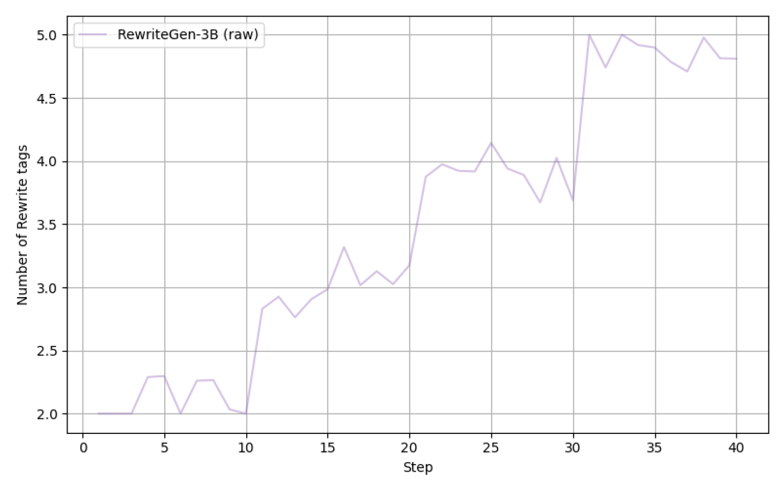 Number of Rewrite Operations. Figure 4 presents the average number of rewrite labels during the model training process. We compute the average number of query rewrite operations per rollout during training. As shown in the figure, the frequency of rewrite operations exhibits steady growth throughout training, indicating that the model learns to iteratively refine queries for complex multi-hop questions, enhancing retrieval relevance.