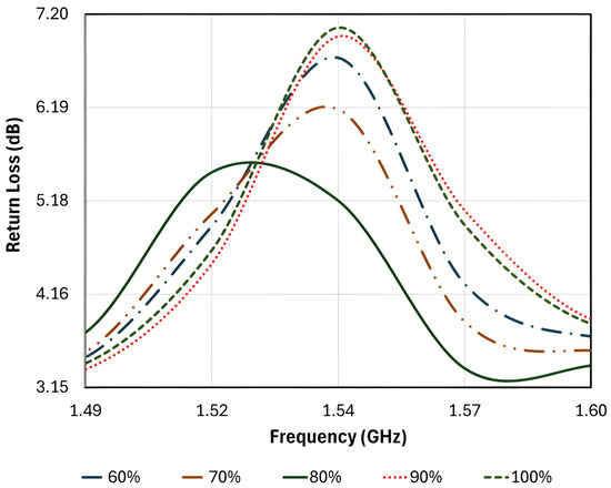 The performance of the proposed sensor design was evaluated using a Zeenko nanoVNA (model SAA-2, serial number 22060725; manufactured by Zhejiang Zhike Technology Co., Ltd., Hangzhou, Zhejiang, China). Simulations conducted with Ansoft HFSS v12.1 (Figure 4) revealed that during resonance, the peak electric field is concentrated at the center of the sensor where the CSRRs are positioned, and it diminishes rapidly to an insignificant magnitude beyond the circumference of the CSRRs. This indicates that the sensor achieves its highest sensitivity at the center. To measure milk concentration, a beaker containing a 50 mL water-based solution was therefore placed at the center of the sensor’s surface, as demonstrated in Figure 5. The return loss of a 0% milk solution was first recorded as the reference for subsequent comparisons. The milk concentrations selected for this study range from 60% to 100%, corresponding to water adulteration levels of 0% to 40%. This range is consistent with realistic adulteration scenarios, as higher water content (>40%) would visibly dilute the milk, making it unlikely to pass consumer scrutiny. This choice is supported by previous studies, e.g., Lanjewar, Parab, and Kamat [13], which investigated water adulteration in milk from 1% to 40%. In this case, full-cream milk was diluted with water and poured into the beaker. The ratio of full-cream milk to water in the 50 mL solution was varied from 60% to 100% milk, with 10% increments. It is interesting to observe from the return loss curves in Figure 6 that, other than the curve at milk concentration M = 80%, the resonant frequency fr = 1.2125 GHz remained remarkably stable, while the magnitude of the return losses varied with different milk concentrations. Since resonant frequency is directly influenced by the effective dielectric constant, this observation suggests that the variation in milk concentration has minimal impact on the electrical properties, particularly the dielectric constant, of the solution. However, it alters the input impedance of the sensor, leading to changes in the magnitude of the return loss.