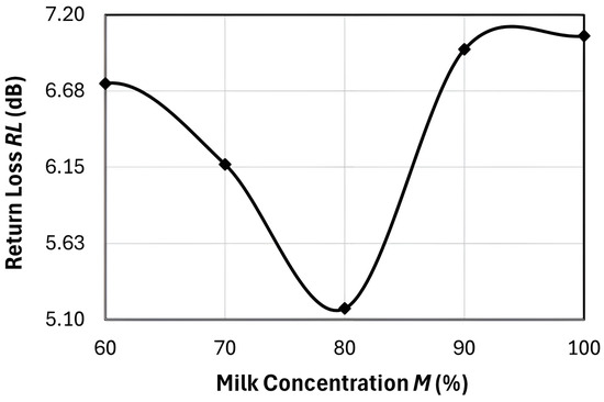 Plot of the return loss (RL) at milk concentration M = 60% to 100%.