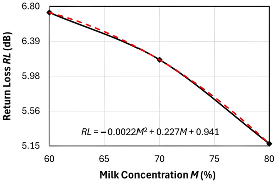 To correlate the measurement results with the milk concentration, the return loss magnitudes at the resonant frequency were plotted against milk concentration. As observed in Figure 7, the curves exhibit significant fluctuations, making direct mathematical correlation challenging. To address this, the data was segmented into two ranges: 60% to 80% and 80% to 100% milk concentrations. Second-order polynomial regression was applied to each segment, allowing milk concentration (M) to be expressed in terms of return loss (RL). A quadratic equation was then solved to determine the milk concentration. As shown in Figure 8 and Figure 9, the closed-form equations for the curves ranging from M = 60 to 80% and 80% to 100% are given, respectively, as