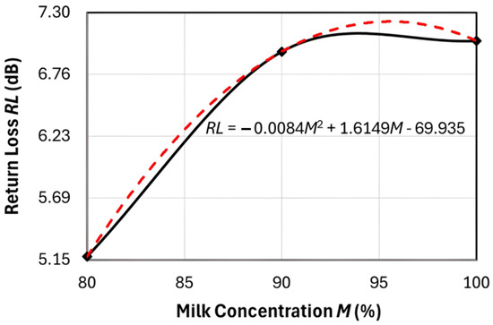 Plot of the return loss (RL) at milk concentration M = 80% to 100%. The solid line is obtained from measurement, while the dashed line is derived from second-order polynomial regression.