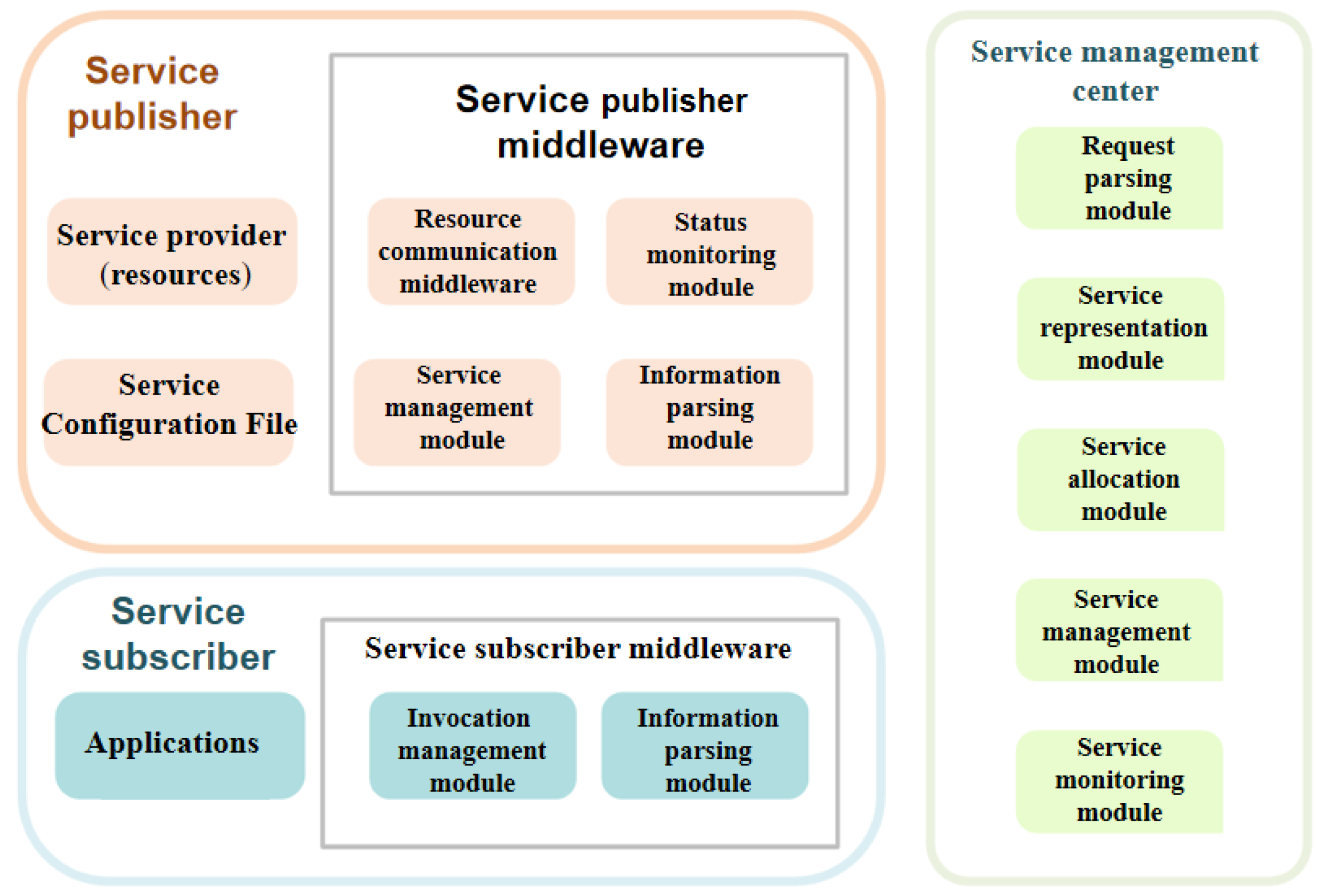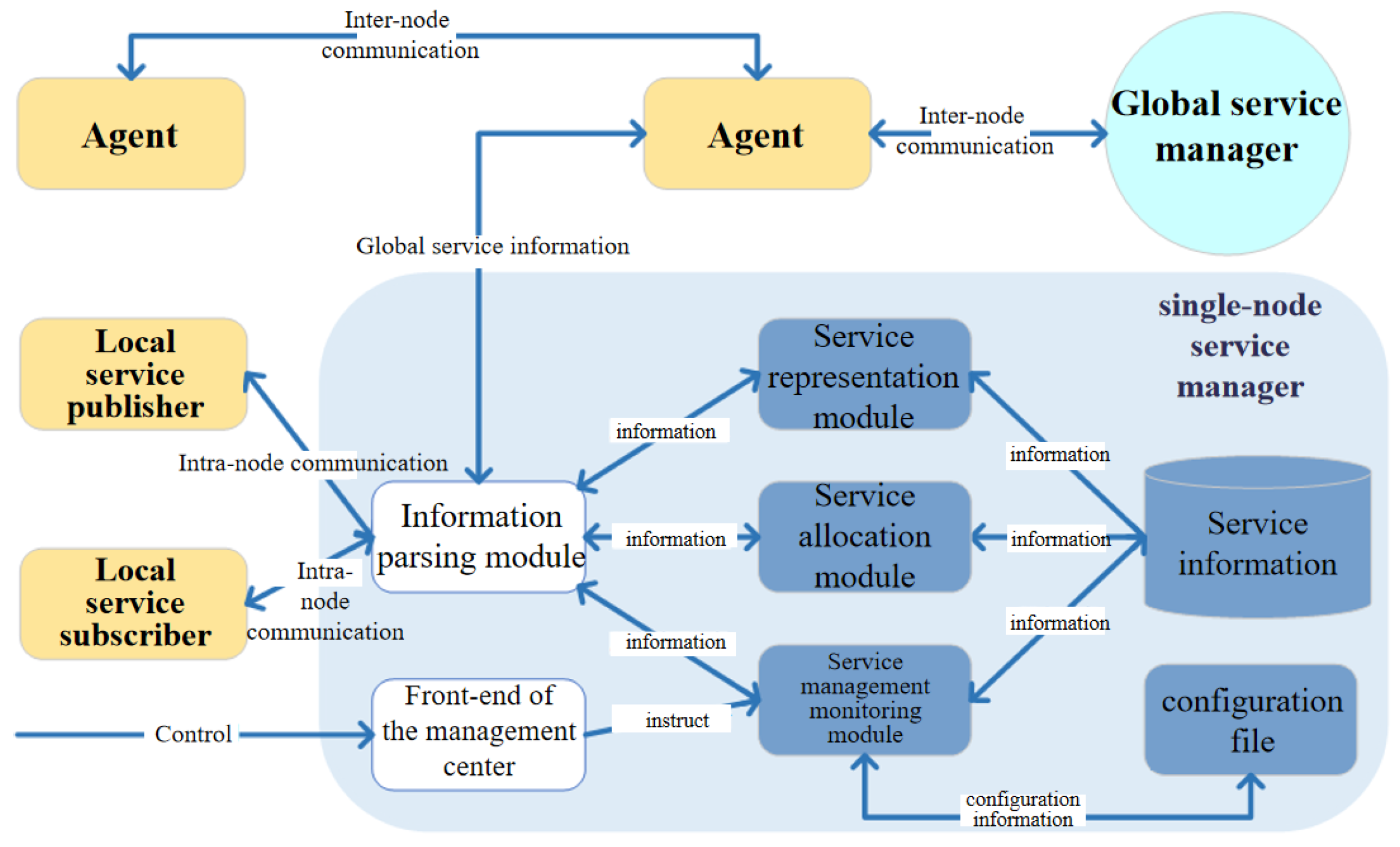 - The single-node service manager: The structure of the single-node service manager is shown in Figure 5, consisting of five parts: the information parsing module, the front-end of the management center, the service representation module, the service allocation module, and the service management monitoring module.