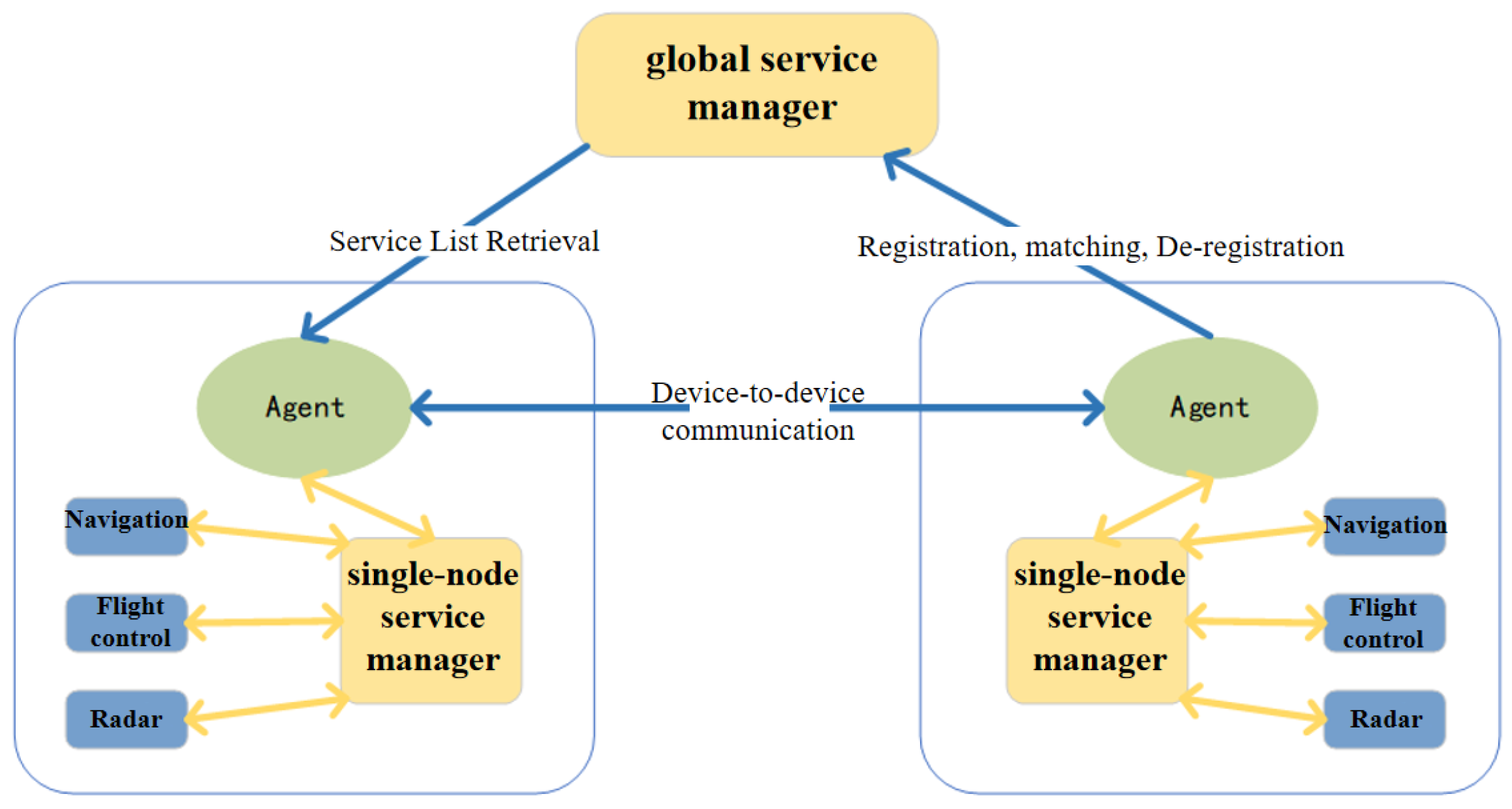 - On the basis of modeling, this paper proposed and implemented a multi-level service management framework. Traditional centralized service management systems often face performance bottlenecks as the number of services and platform nodes increases, making it difficult to scale. This framework consists of an agent-based service middleware, a single-node service manager, and a global service manager, supporting the registration, discovery, invocation, monitoring, and combination of resource services. Unlike traditional centralized architectures, this multi-level framework alleviates the load on a single management node by introducing service agents and dividing the management responsibilities. The service agent middleware adapts and forwards communication between intra-node and inter-node systems, shielding platform-specific differences. The single-node service manager ensures rapid response for local services, while the global service manager coordinates the scheduling and optimization across platforms. This architecture effectively solves the performance bottleneck problem of centralized single-node management, improving resource utilization and collaborative operational efficiency in multi-platform environments. In particular, the ability to scale across platforms while maintaining low latency and high stability, even under heavy communication load, is a key advantage of this framework.