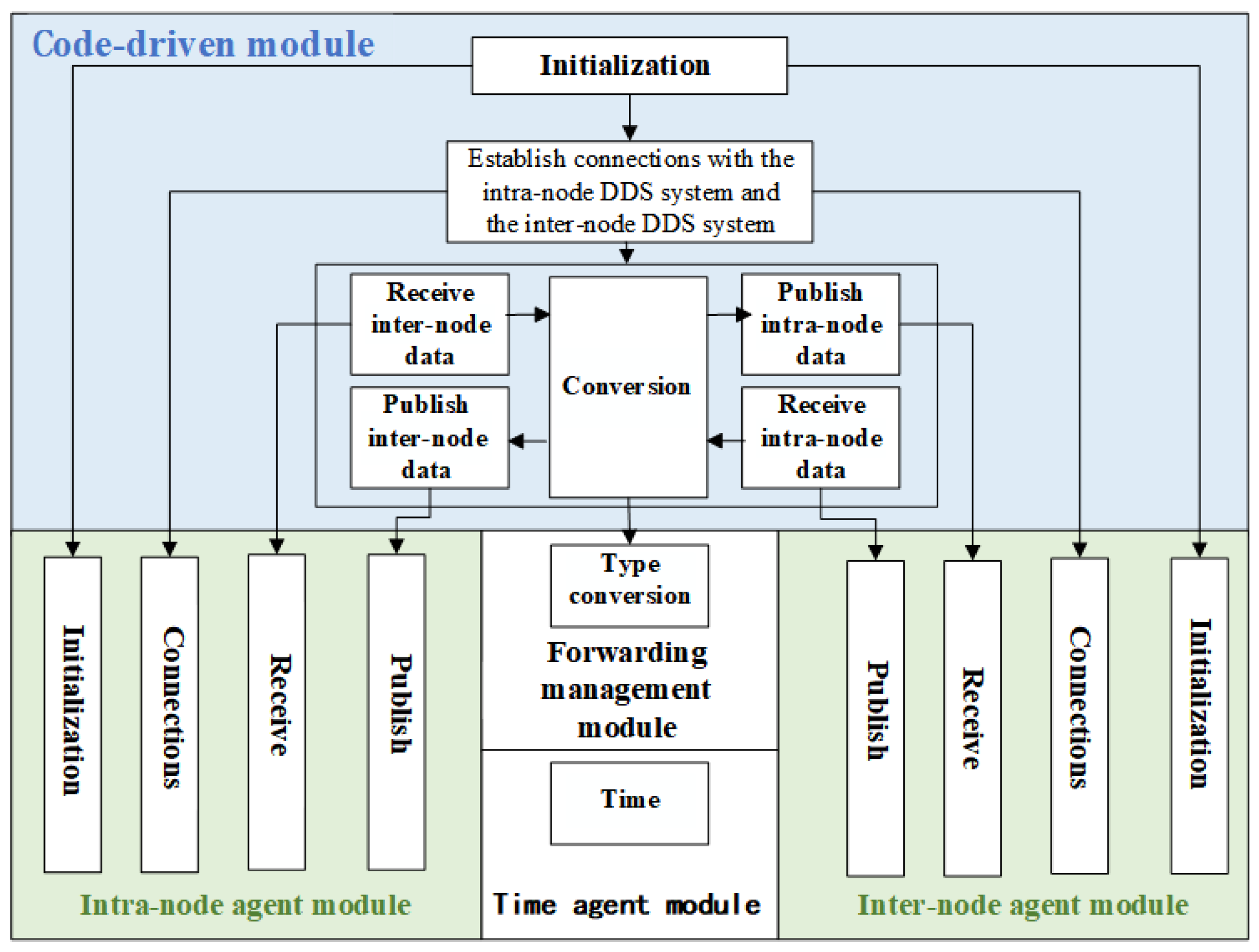 - Service agent middleware: The service agent enables communication between intra-node and inter-node communication systems. As shown in Figure 4, it mainly consists of five parts: the intra-node agent module, the inter-node agent module, the forwarding management module, the time agent module, and the code-driven module.