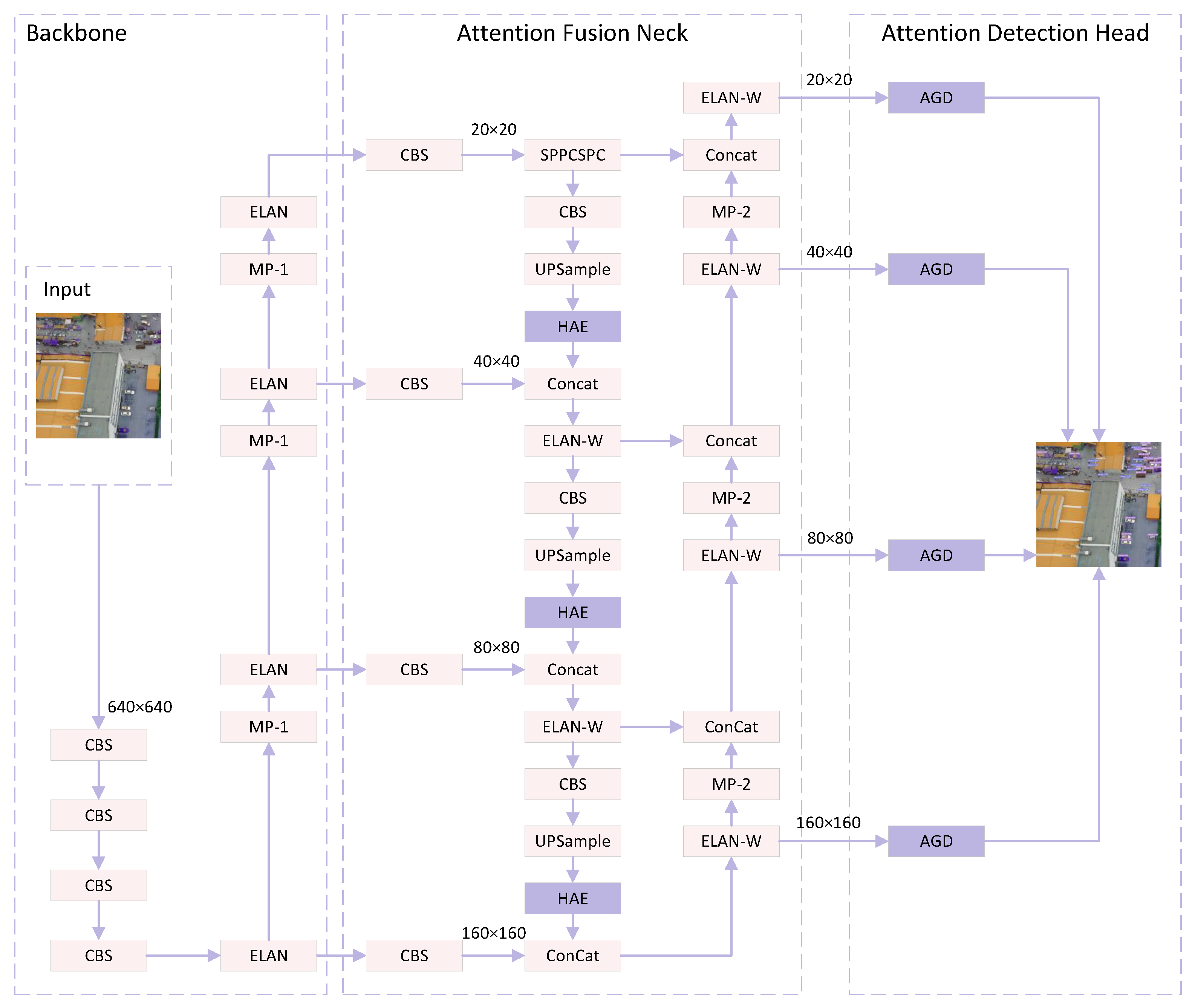 The overall architecture of the proposed MAF-Net. A dedicated small-object detection layer is appended to the YOLOv7 head at the low-level feature map stage, and a coordinate attention mechanism is integrated into the detection head. The detection anchors are clustered using the KMeans++ algorithm to optimize small-object detection performance.