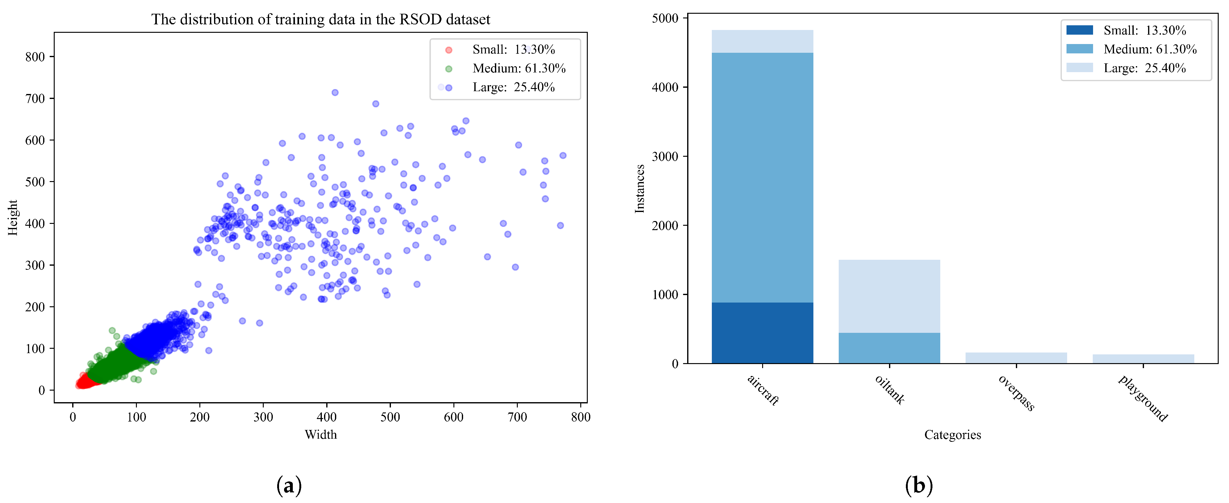 (a) Target size distribution in the RSOD dataset: Small targets (< pixels): 13.30% of total Medium targets (– pixels): 61.30% Large targets (> pixels): 25.40% (b) Quantitative distribution of object categories in RSOD dataset.