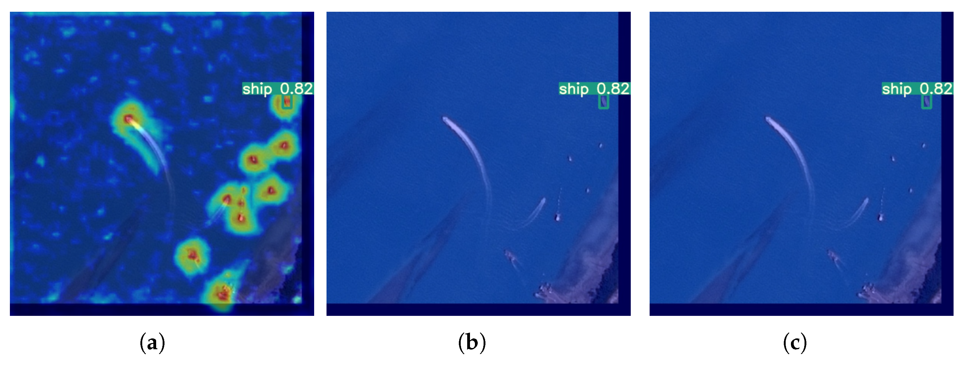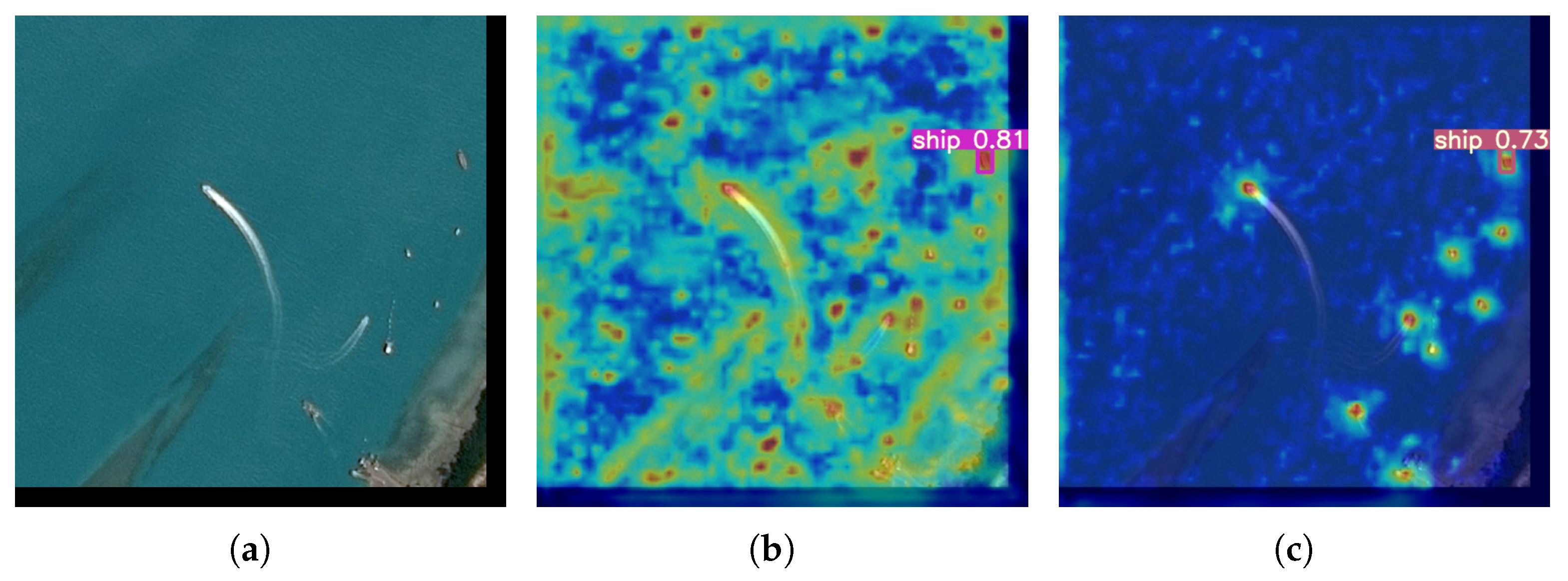 Visualization of attention heatmaps. (a) Original image. (b) Heatmap produced by YOLOv7, exhibiting widespread background activation (attention noise). (c) Heatmap produced by the proposed model, where responses are concentrated on the target regions and background activations are suppressed.