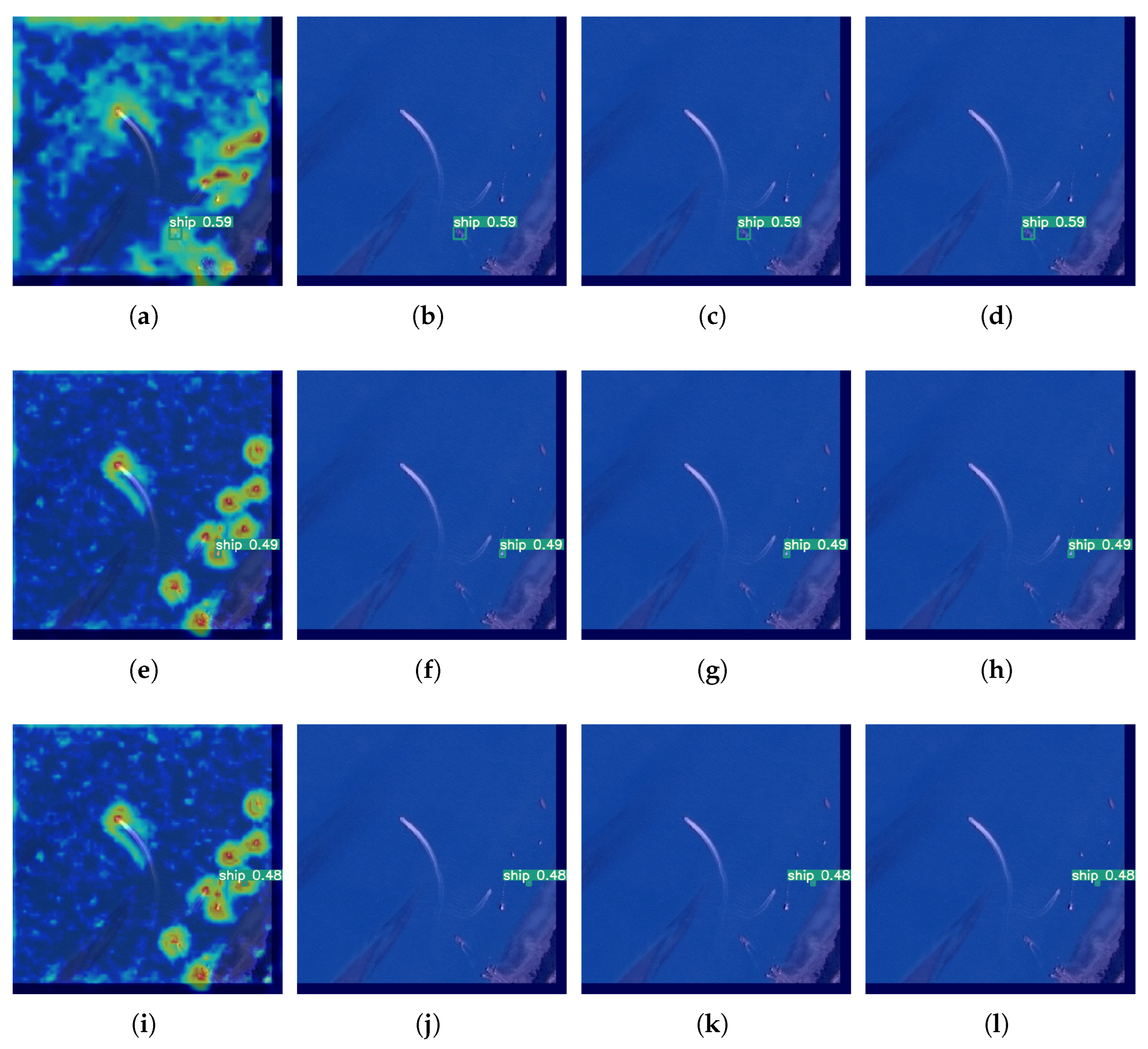 There are four images in each row, (a–d); (e–h); (i–l) are attention heatmaps of a detected target waiting below four detection layers. (a,e,i); (b,f,j); (c,g,k); (d,h,l) are the heatmaps of attention under the 20 × 20, 40 × 40, 80 × 80, 160 × 160 feature maps, respectively.
