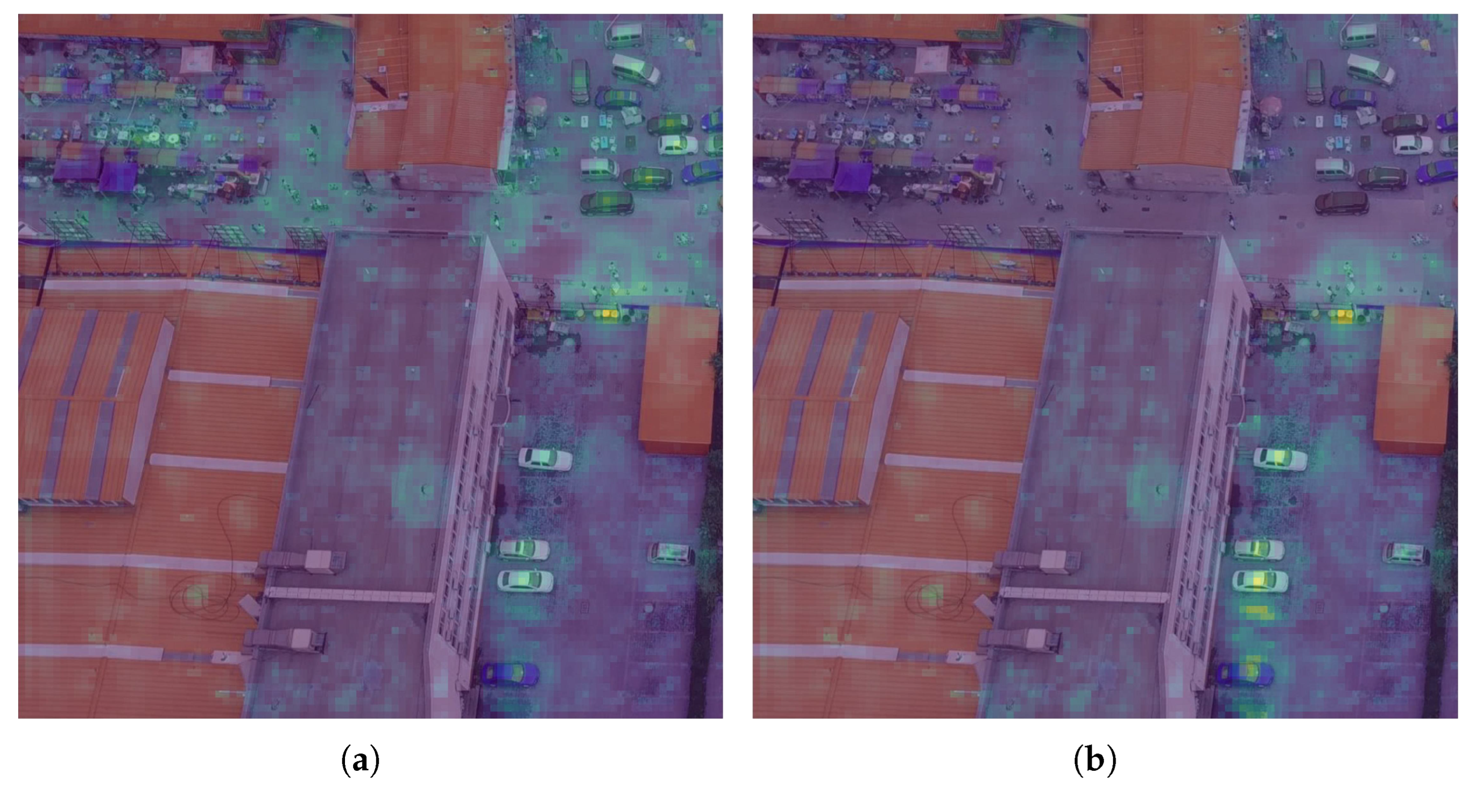 The left image (a) shows the object detection results before applying the Dual-path Attention, while the right image (b) presents the results after applying the Dual-path Attention. In (a), 205 vehicles were detected, whereas in (b), 300 vehicles were detected. This demonstrates that the Dual-path Attention can enhance the detection accuracy of small targets in areas with a high density of such targets.