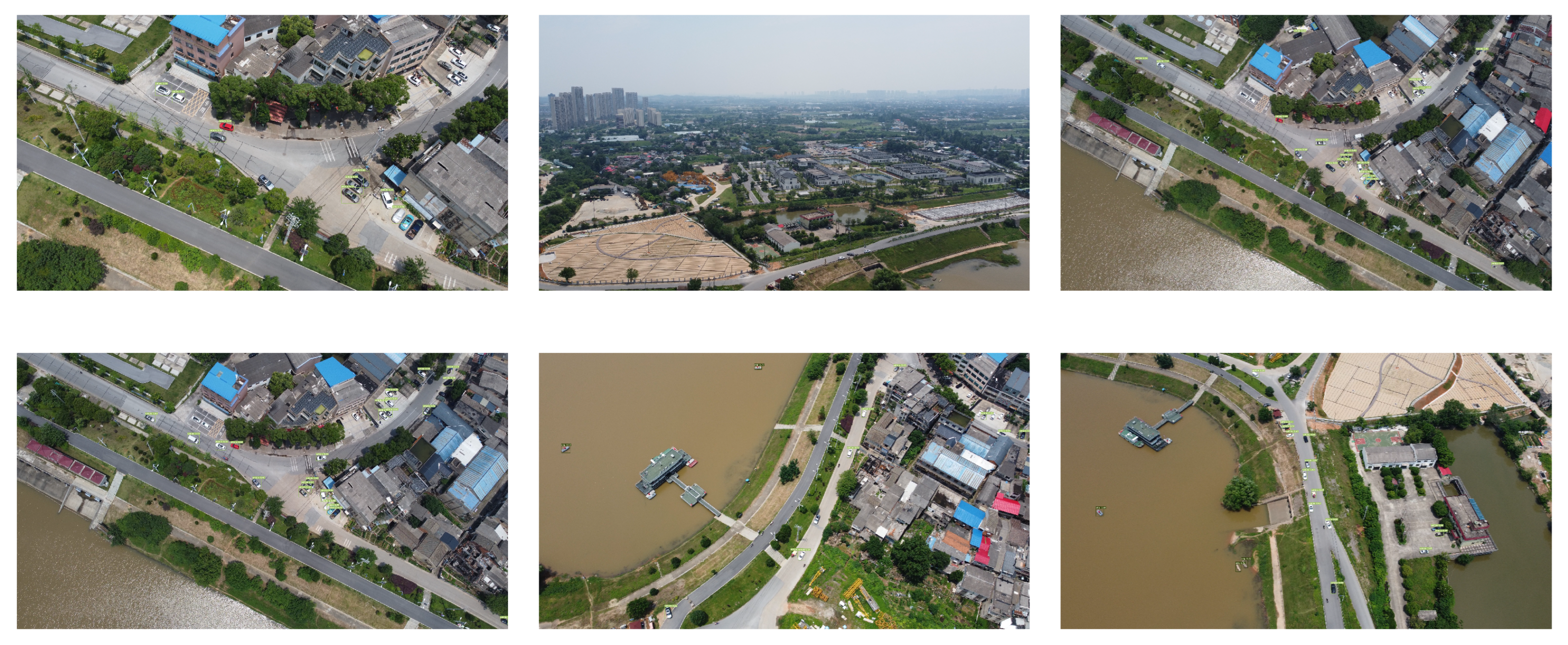 Sample images of the dataset under different altitude conditions. (a) High-altitude aircraft UAV image; (b) Medium-altitude aircraft UAV image; (c) Low-altitude aircraft UAV image; (d) High-altitude helicopter UAV image; (e) Medium-altitude helicopter UAV image; (f) Low-altitude helicopter UAV image.