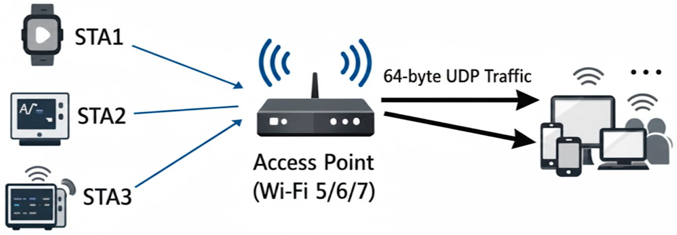 The traffic consists of 64-byte UDP packets sent in the uplink direction (STA to AP). This size is representative of real-world IoMT telemetry once encapsulated with IPv4 (20 bytes), UDP (8 bytes), and lightweight protocol overhead (e.g., MQTT-SN or CoAP). Medical sensor communication studies report that typical ECG sensors output data streams on the order of tens of kilobits per second, while SpO