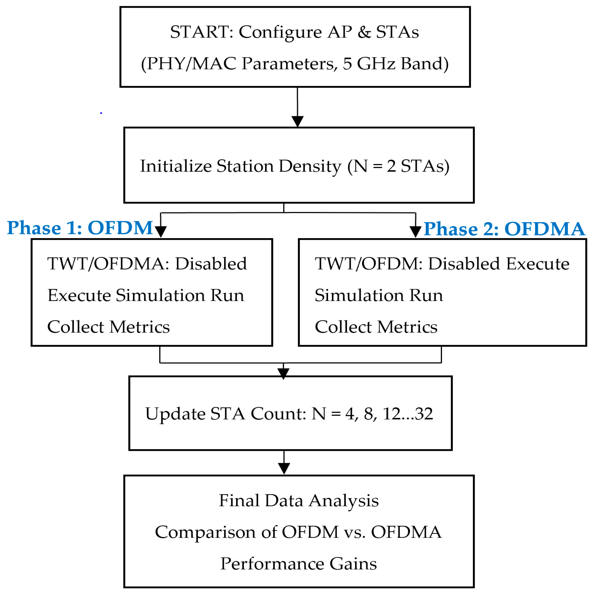 Traffic is always uplink from STA to AP. TWT scheduling is applied in the TWT scenario to simulate energy-saving mechanisms, where STAs are awake only during scheduled intervals. NS-3 allows controlled and repeatable simulations, ensuring that OFDM, OFDMA, and TWT are evaluated under identical conditions. While real-world experiments could capture additional environmental variability, practical constraints in hospitals, including limited access and patient safety, make NS-3 the preferred tool. The simulation setup also allows precise control of payload sizes, device counts, and channel conditions, which is essential for IoMT-focused studies.
