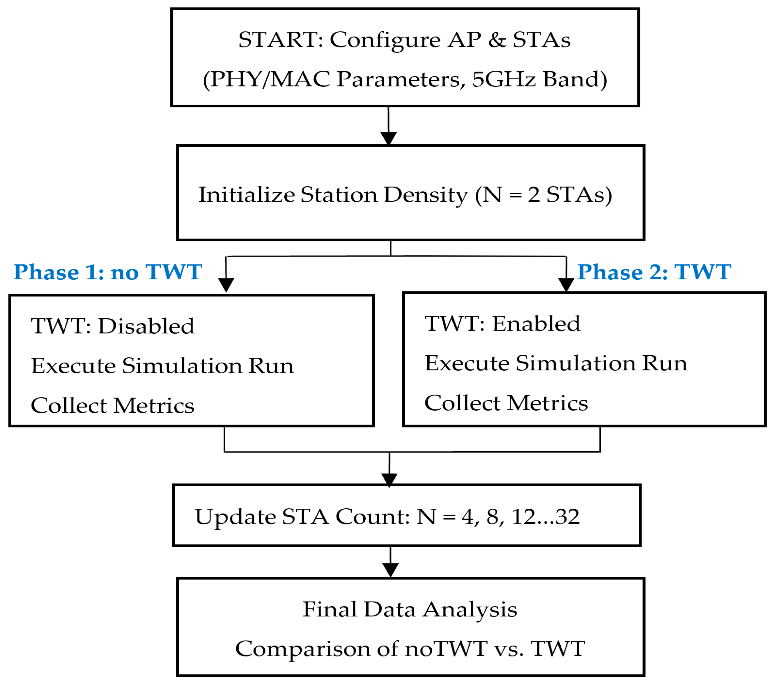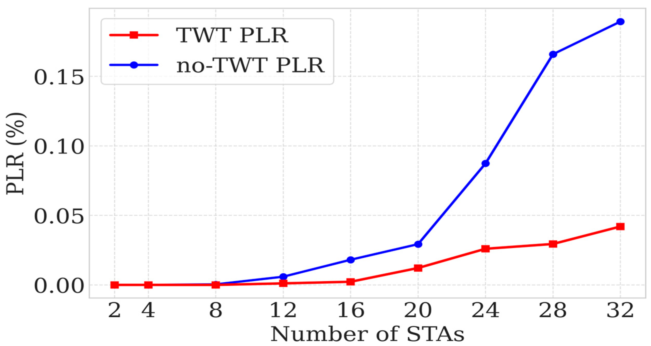 19]. This mechanism allows multiple STAs to perform simultaneous uplink transmissions without packet collisions, improving both efficiency and reliability. By coordinating device transmissions, TWT minimizes channel contention, thereby reducing packet loss and improving overall QoS.