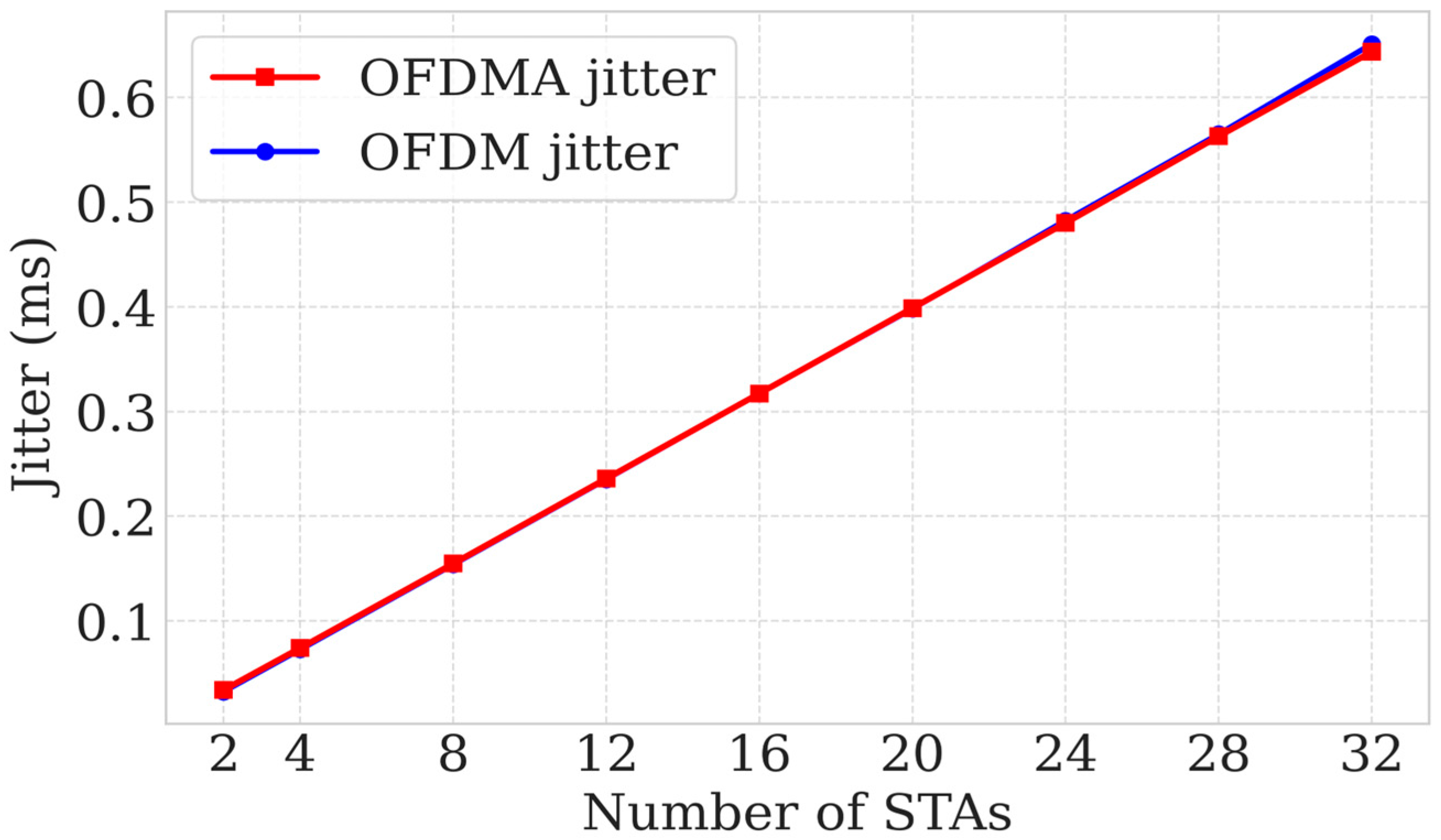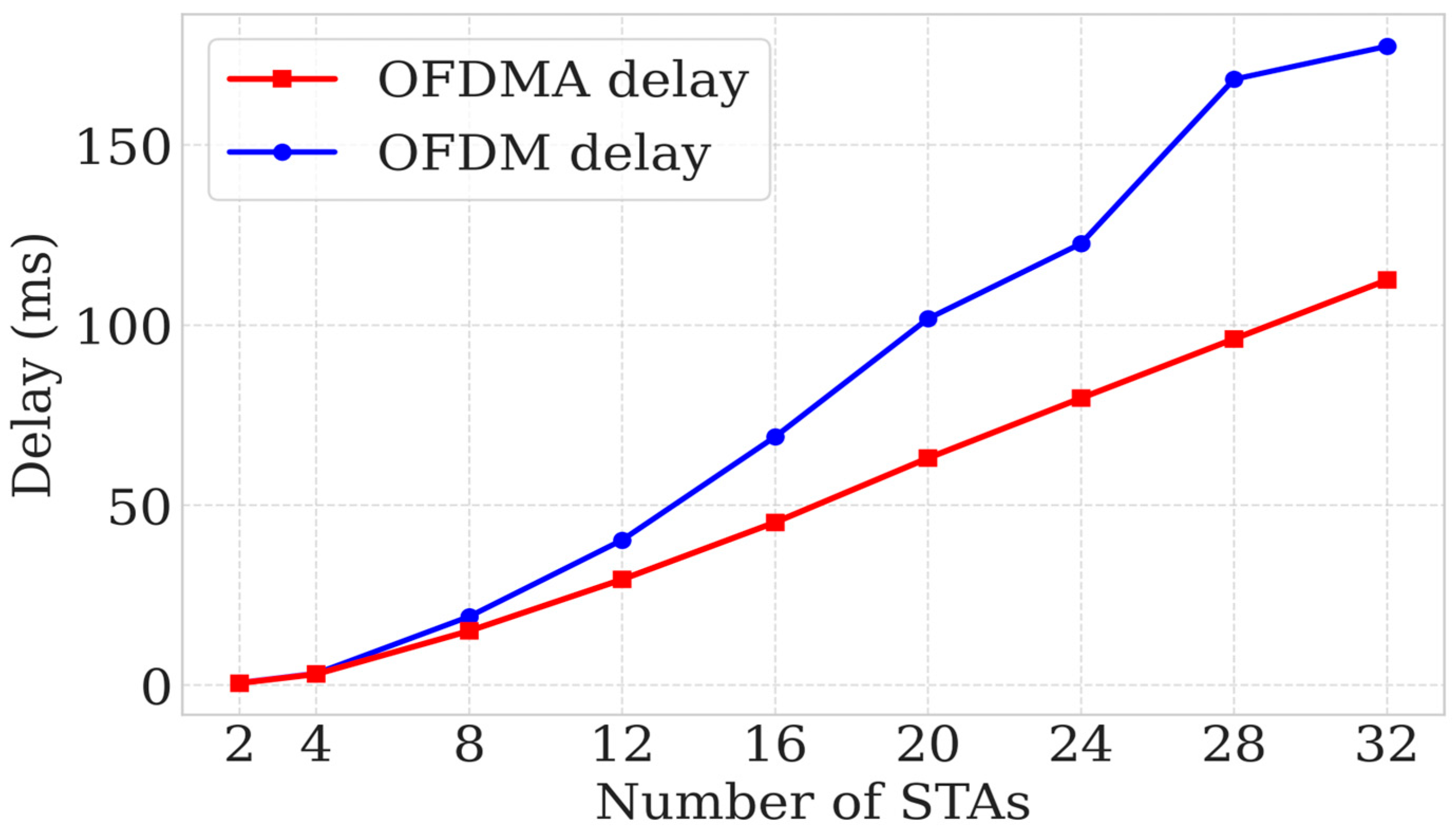 The following subsections present a comparison between OFDM (baseline, Wi-Fi 5) and OFDMA (Wi-Fi 6/7) across key QoS metrics, using simulations with STA densities of 2, 4, 8, 12, 16, 20, 24, 28, and 32. All results are illustrated in