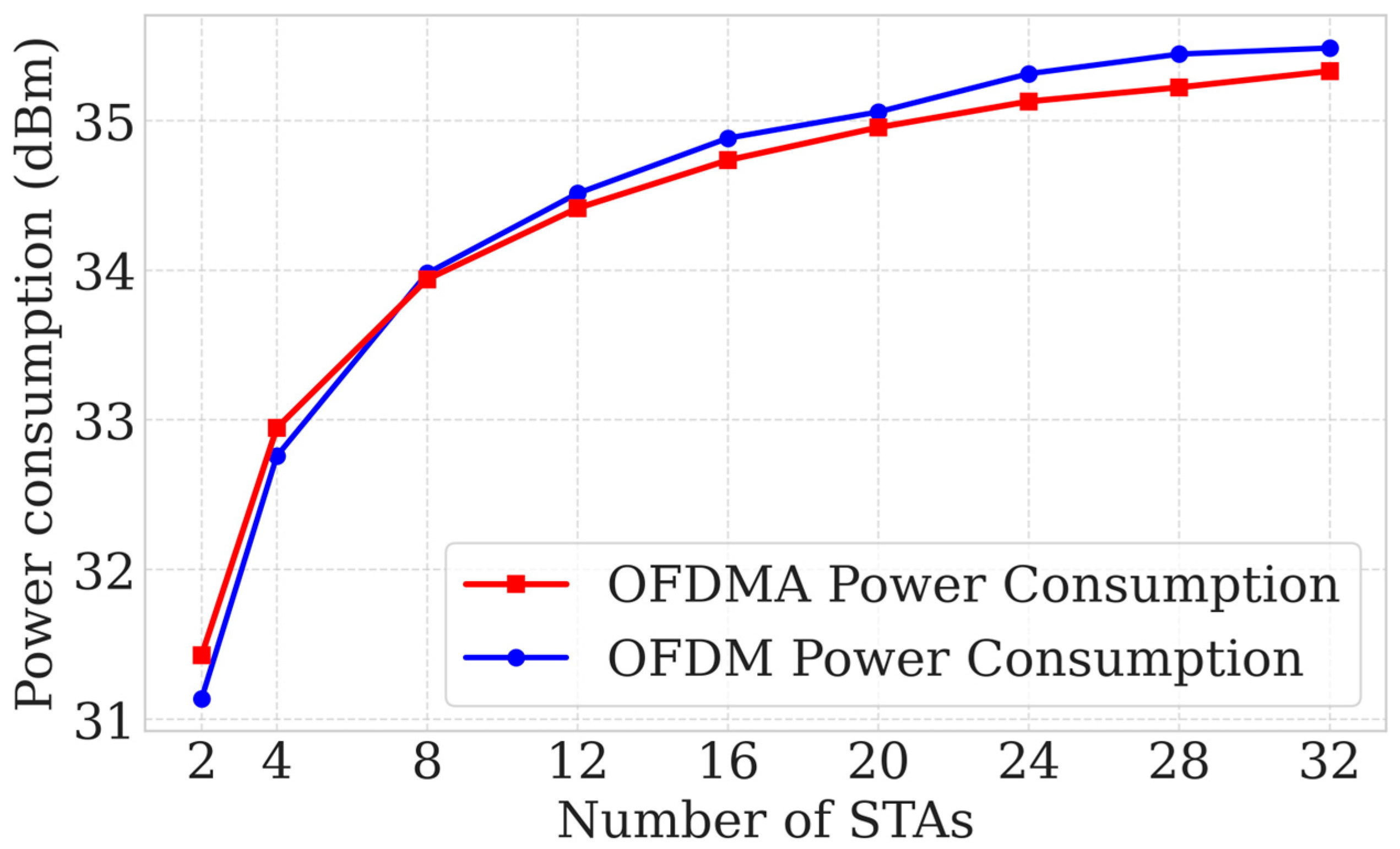 Figure 5, the network’s power consumption exhibits a comparable upward trend for both protocols as the number of stations increases. However, OFDMA maintains a slight but consistent efficiency advantage, achieving an approximate 3% reduction in energy usage compared to OFDM. This improvement is primarily due to OFDMA’s ability to serve multiple STAs simultaneously through Resource Unit (RU) allocation. By grouping transmissions, the access point (AP) significantly reduces the cumulative overhead associated with individual channel access and “listen-before-talk” contention periods required by OFDM. While the margin remains modest, this enhanced efficiency is particularly beneficial for energy-constrained IoMT devices, where even marginal power savings can extend the operational longevity of critical medical sensors in dense deployments.