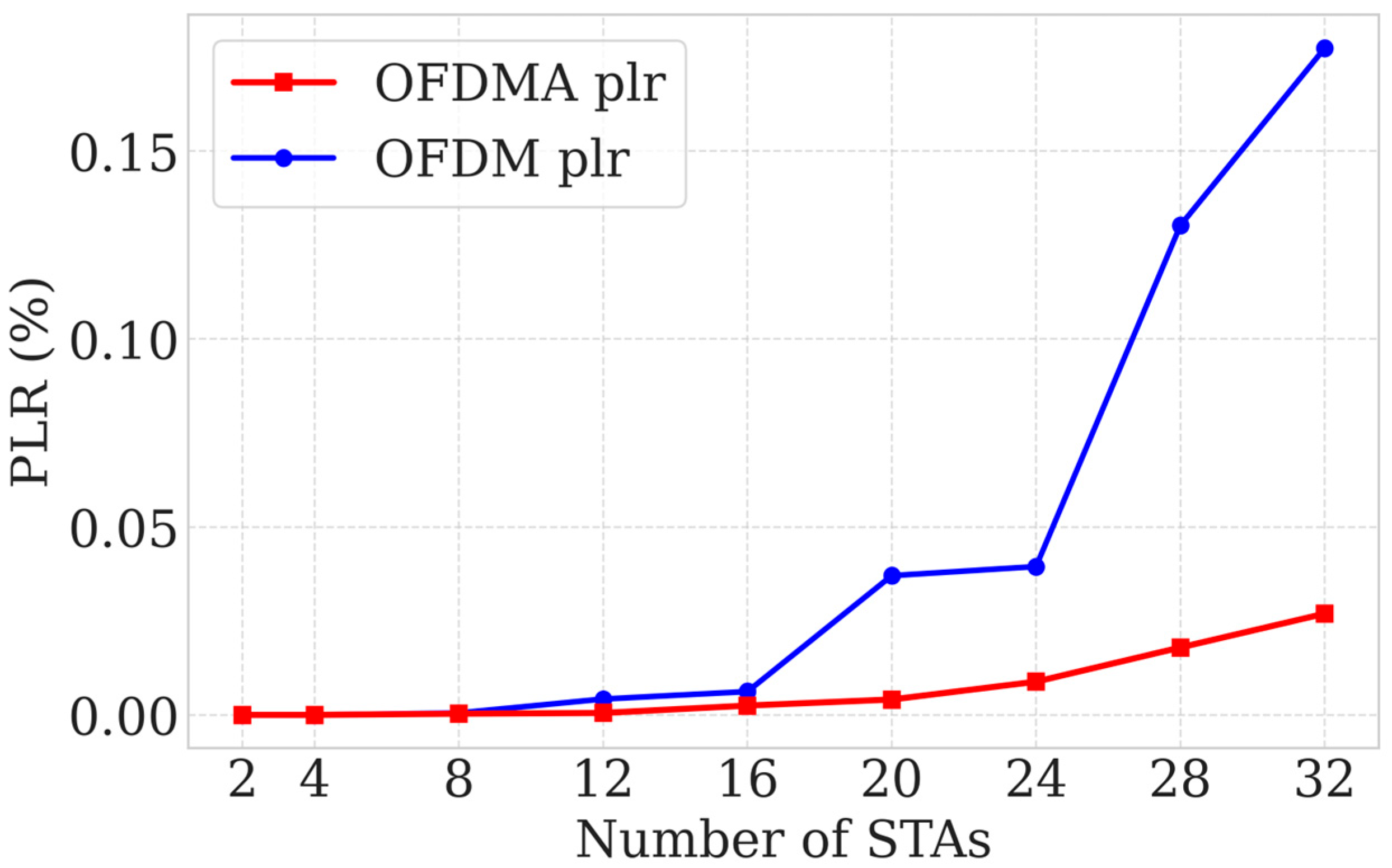 Figure 7, the packet loss ratio (PLR) highlights a critical divergence in the network’s reliability between the two protocols as the environment becomes more congested. While both methods maintain negligible packet loss at low station counts, OFDM experiences a sharp increase in packet loss beyond 16 STAs, reaching a peak PLR of approximately 0.18% at 32 stations. Conversely, OFDMA exhibits a far more stable performance, maintaining a significantly lower packet loss rate of roughly 0.025% under the same conditions. This equates to an approximate 85% reduction in packet loss compared to OFDM, an advantage that becomes increasingly important as the number of STAs increases. This superior reliability is primarily due to OFDMA’s multi-user scheduling and Resource Unit (RU) allocation, which effectively minimizes the collisions and subsequent retransmissions inherent in the contention-based access of OFDM. Consequently, OFDMA ensures the robust data integrity required for high-density IoMT applications where packet loss could compromise patient monitoring.