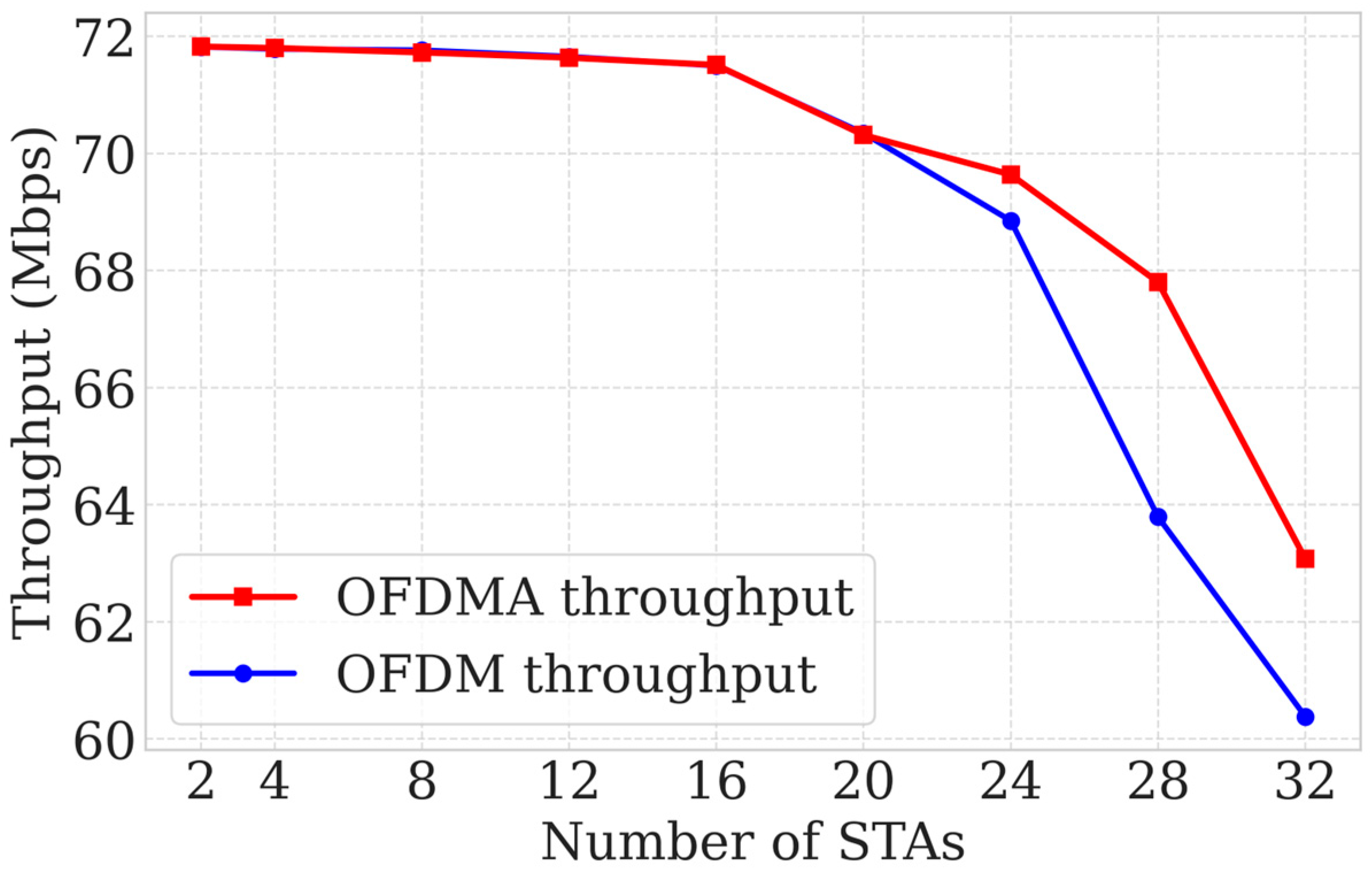 Figure 8, which demonstrates that while both methods perform similarly at low densities, a substantial performance gap develops as the number of stations exceeds 20. In high-density scenarios, OFDM experiences a steep decline in throughput due to increased channel contention and collision overhead, falling to approximately 60 Mbps at 32 STAs. In contrast, OFDMA exhibits superior resilience, maintaining a higher throughput of roughly 63 Mbps under identical conditions. This represents an approximate 20% improvement in comparative throughput efficiency at peak density by mitigating the degradation typically seen in single-user access models. This enhanced performance is achieved by Resource Unit (RU) allocation that maximizes spectral efficiency and allows for parallel data streams. Consequently, OFDMA provided a more resilient data transfer capability better suited for supporting high densities of concurrent devices in a hospital environment compared to the legacy contention-based models.