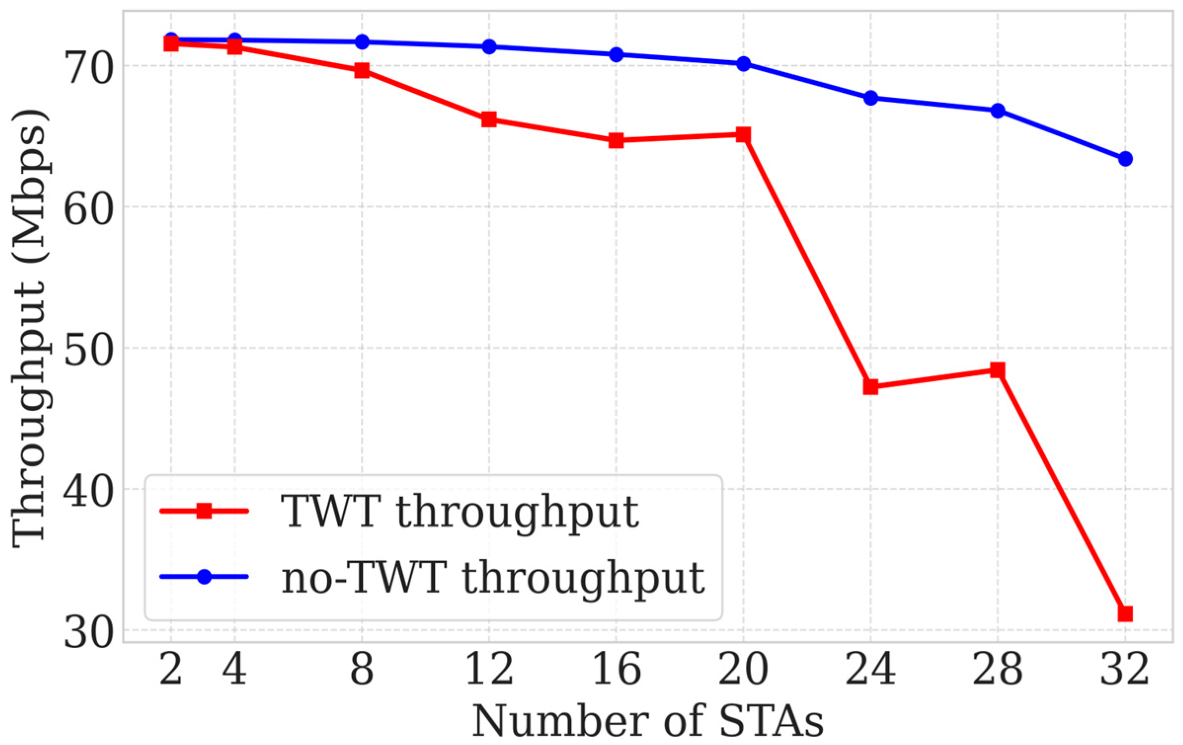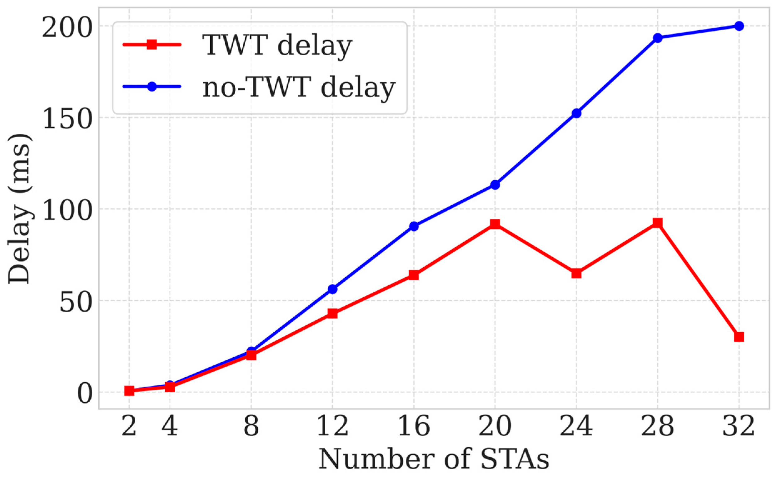 Figure 9, highlighting a significant divergence in performance as the station density scales. While the network without TWT experiences a sharp increase in delay—climbing to approximately 200 ms at 32 STAs—the TWT-enabled configuration maintains a remarkably low and stable profile. Specifically, at peak density, TWT limits the delay to roughly 30 ms, representing a substantial reduction compared to the non-TWT scenario. This enhanced stability is primarily due to TWT’s scheduled access mechanism, which allows stations to wake and transmit within dedicated time windows. By coordinating these transmission periods, TWT effectively mitigates the channel contention and congestion inherent in dense environments, ensuring the reliable, low-latency communication necessary for real-time medical IoMT applications.