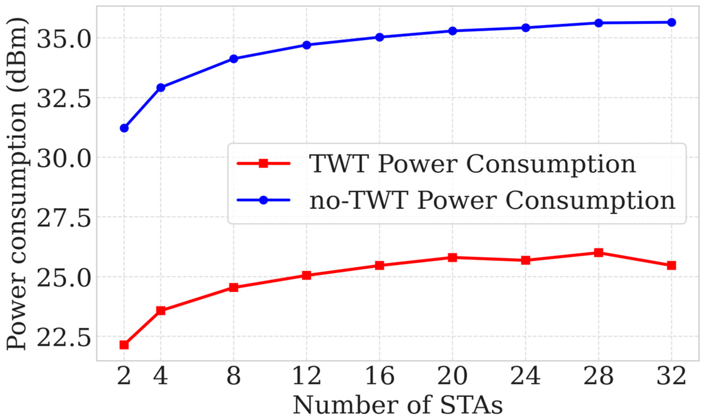 Figure 10, demonstrating a substantial reduction in energy usage across all station densities. While the network without TWT exhibits high power consumption, rising to approximately 35.5 dBm as the number of stations increases, the TWT-enabled configuration maintains a much lower energy profile, consistently remaining below 26.5 dBm. This performance represents a dramatic efficiency gain, achieving power savings of up to 90% in comparison to non-TWT deployments. Such a significant improvement is due to the TWT scheduling mechanism that allows stations to remain in a low-power sleep mode for extended periods and only wake during negotiated time slots. By minimizing unnecessary channel sensing and contention overhead, TWT provides an essential energy-saving framework for battery-constrained IoMT devices operating in dense medical environments.