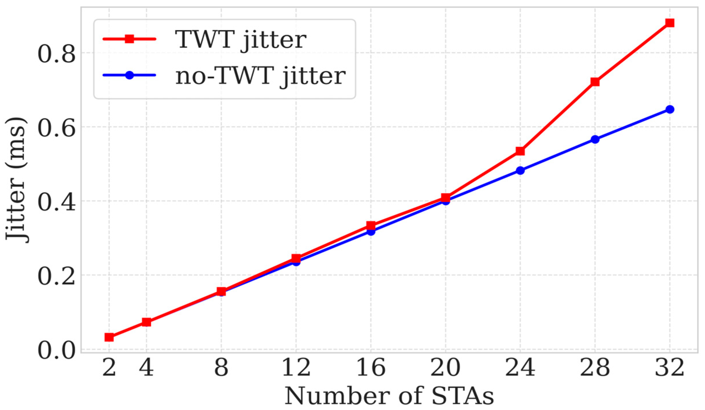 Figure 11, the jitter performance with TWT enabled reveals a distinct trend as station density increases. While both configurations maintain nearly identical jitter levels at lower densities, a divergence occurs beyond 20 STAs. Specifically, the TWT-enabled network experiences a more pronounced increase in jitter, reaching approximately 0.85 ms at 32 STAs compared to roughly 0.65 ms for the no-TWT scenario. This increase is primarily due to the inherent timing variability introduced by the scheduled wake-up mechanism, as STAs must wait for their precise negotiated windows to transmit. Although this introduces a slight trade-off in timing consistency, the overall network stability and reliability remain superior to the no-TWT model when considering the significant gains in delay and power efficiency. Consequently, while TWT-induced jitter requires careful management in latency-sensitive applications, it does not undermine the protocol’s effectiveness in supporting high-density IoMT environments.