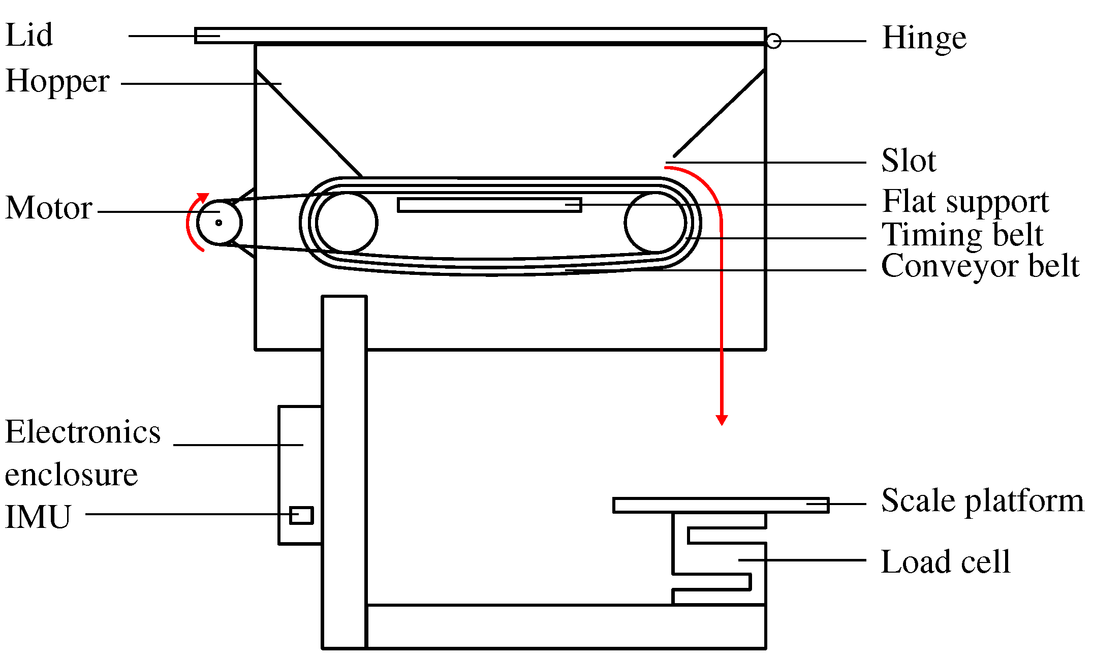 Figure 1, the red arrows indicate the motor’s clockwise rotation and the resulting transport of feed toward the centre of the weighing platform. The shaft-to-shaft distance was adjusted to ensure adequate belt tension while supporting a maximum load of 1 kg of feed. Furthermore, the load cell of the weighing system was positioned directly beneath the belt’s discharge slot. For this purpose, a weighing platform was designed and mounted on the load cell to support the feed tray. Considering the mechanical assembly as a rigid body, an inertial measurement unit (IMU) was integrated within the electronics compartment to record the inclination of the weighing system.