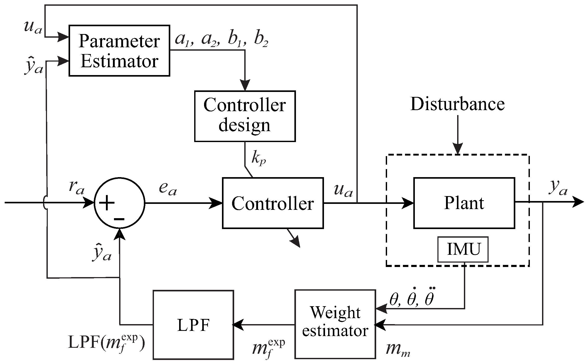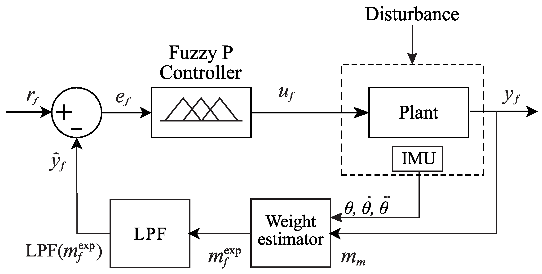 Consequently, the main contributions of this work are threefold. First, the study presents the development of a physics-informed weight estimator that decouples the platform’s oscillatory dynamics from the mass measurement using inertial sensor fusion, effectively isolating the gravitational mass component from inertial disturbances. Second, it details the design and validation of a data-driven Fuzzy-P controller based on subtractive clustering, which generates a non-linear control surface capable of handling actuator saturation without overshoot. Finally, the work provides a comparative experimental analysis between the proposed heuristic fuzzy approach and a model-based Adaptive Self-Tuning Regulator (STR), highlighting the specific limitations of linear adaptive schemes when operating under high-frequency periodic disturbances.