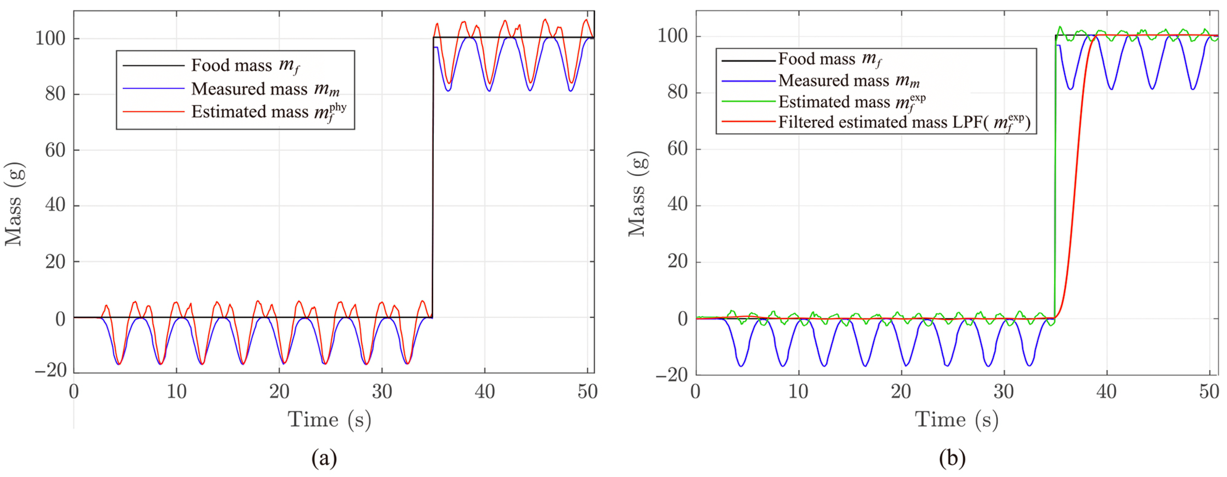g in steady state. However, the filtering stage introduced an approximate delay of 4.2 s. Such delay caused the feeder to dispense excess mass after the reference value was nominally reached; therefore, a practical correction was implemented by applying a fixed offset to the reference command to counteract the delay-induced overshoot.