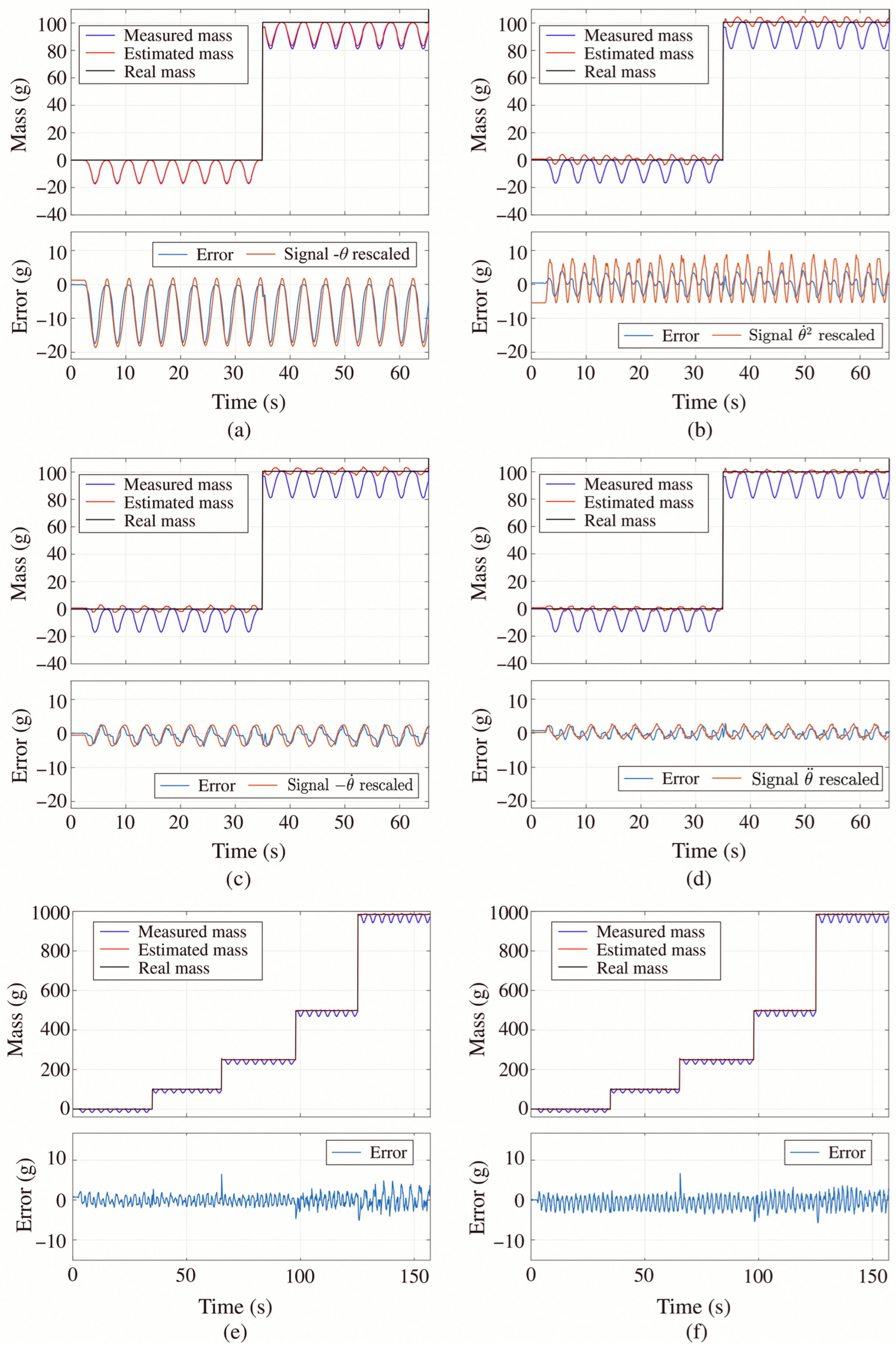 Figure 12d depicts the time response of the adaptive controller for a 100 g reference under full and partial storage conditions. Unlike the other strategies, this controller requires a defined initial condition. This assumes that the angle starts at zero, which introduces a delay while the filtered estimate converges to the actual angle. As a result, the mass estimation during the first samples uses an incorrect angle and momentarily produces negative values. The error in the first dose was 0.16 g, whereas the second dose resulted in an error of