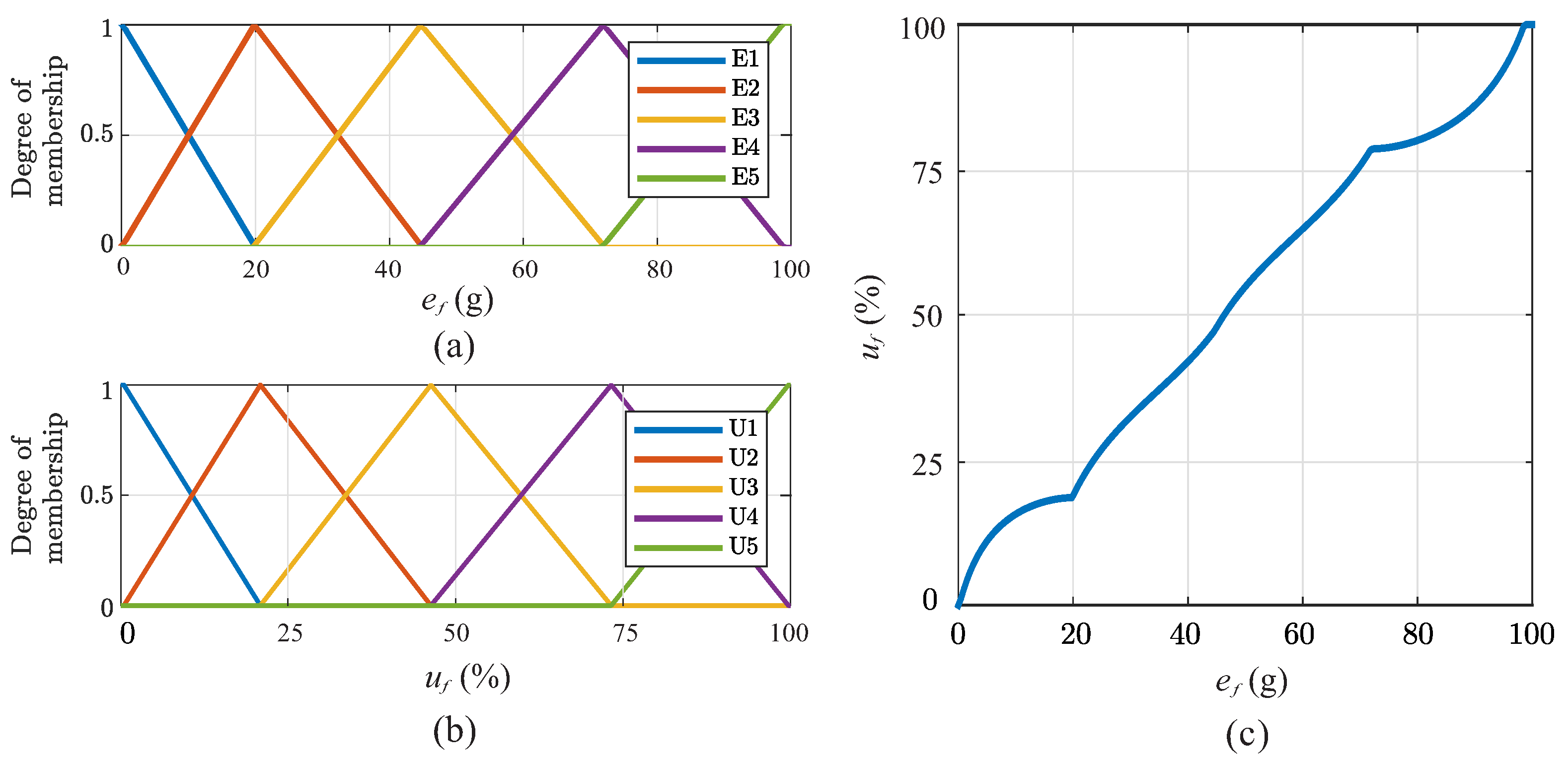 Figure 11c. It is observed that this surface exhibits predominantly linear behavior within the central operating range, indicating that the clustering algorithm identified a proportional relationship as the optimal control policy for small-to-medium errors. However, unlike a fixed-gain proportional controller which would clip abruptly at the actuator limits, the fuzzy architecture naturally incorporates non-linear saturation at the boundaries (